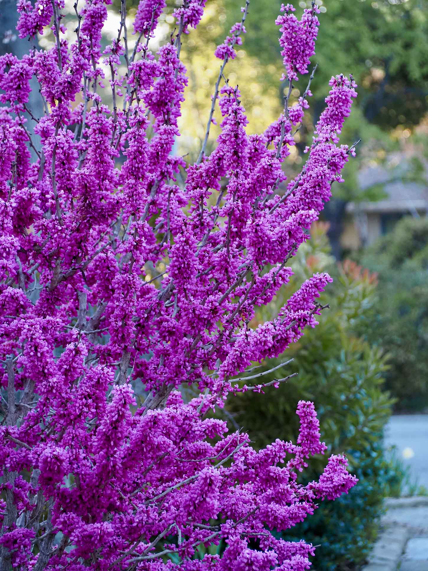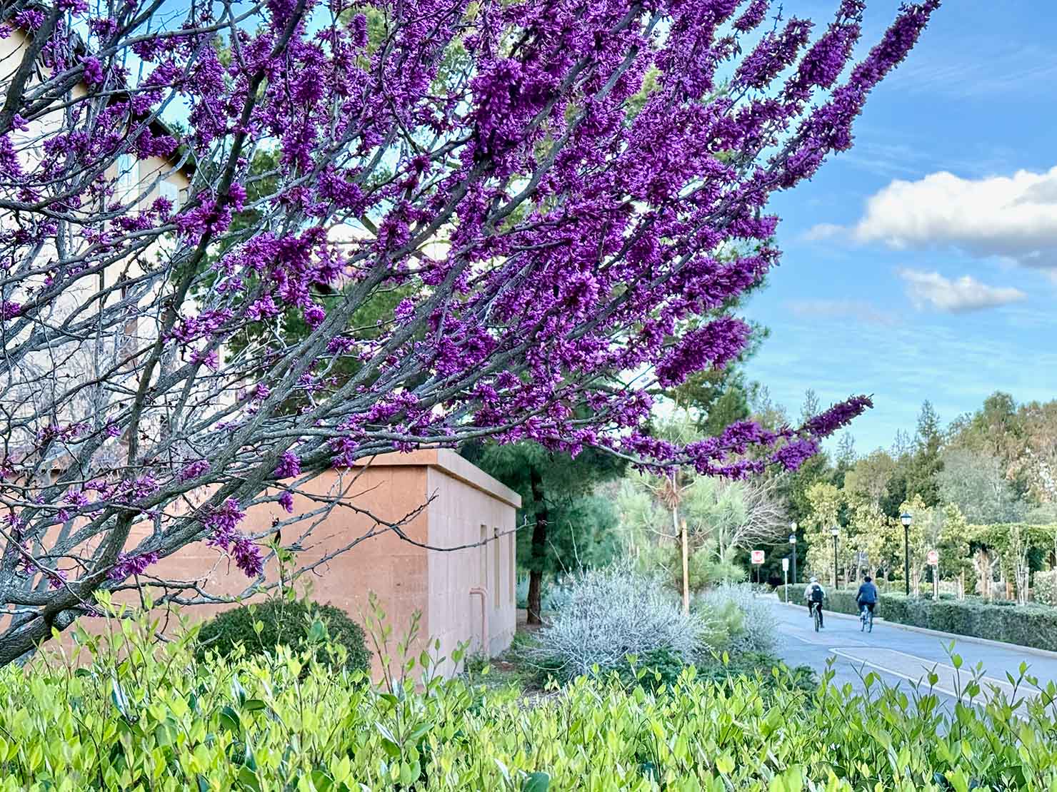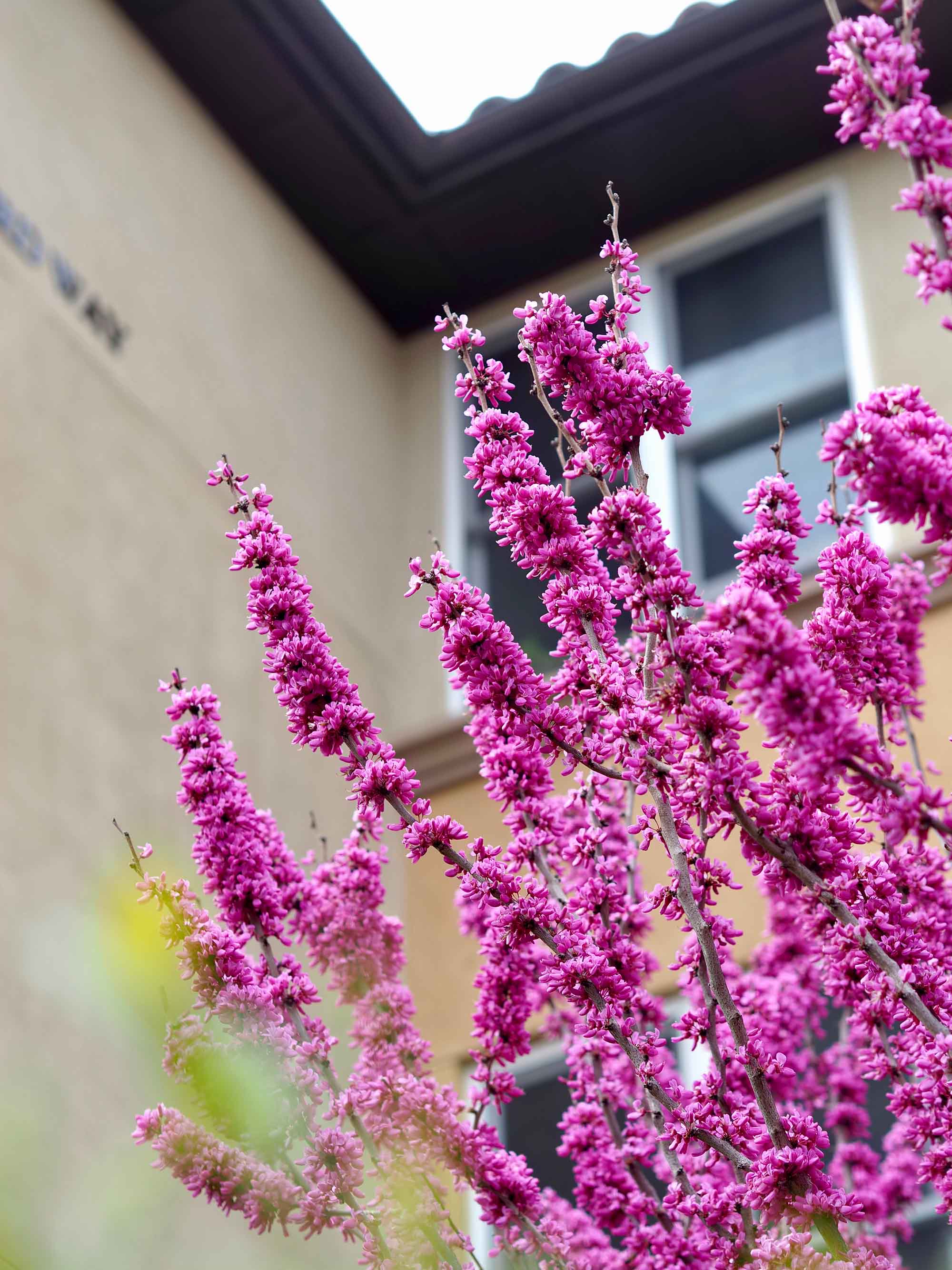 Three (now down to two) first appeared on campus in the Escondido Road and Campus Drive roundabout island in 2014; its stunning and surprisingly early bloom was not an insignificant distraction while trying to navigate that roundabout, campus’s first. Another was planted on the northeastern corner of Ng House when it was built (2015), along with several eastern and western redbuds. Shrubby, multi-stemmed ‘Avondale’ is on the right at 708 Salvatierra Street.