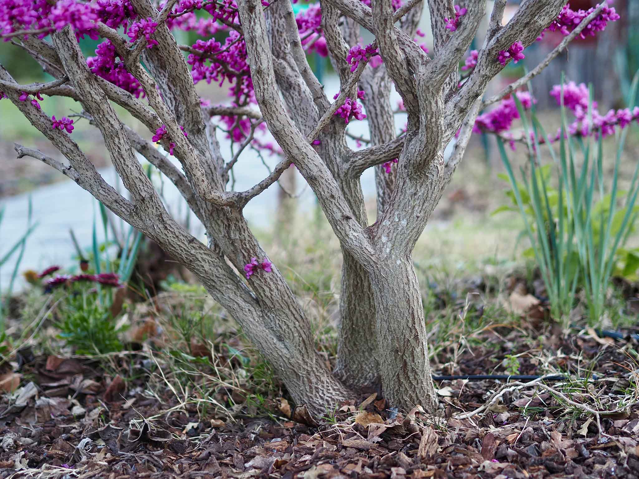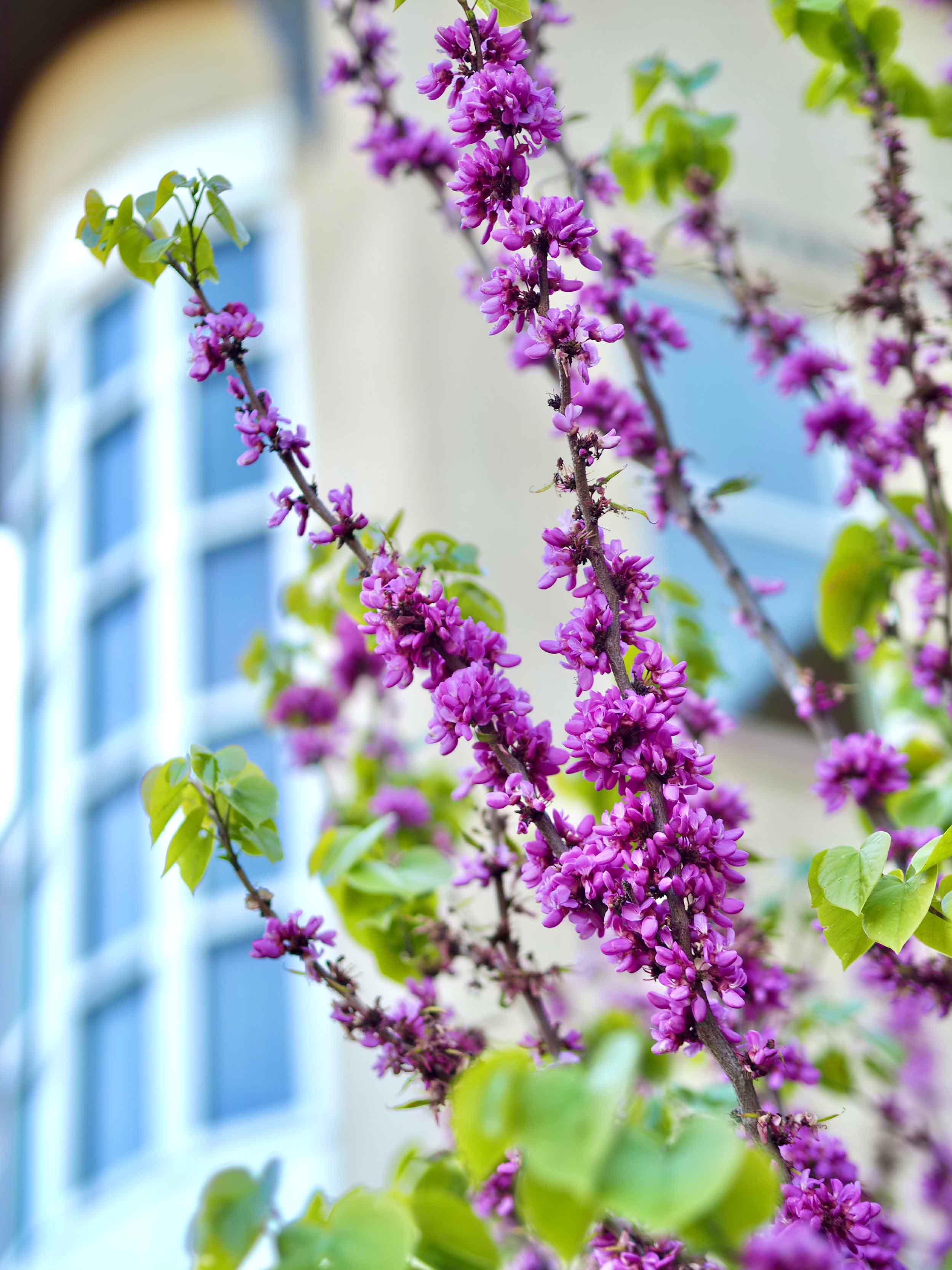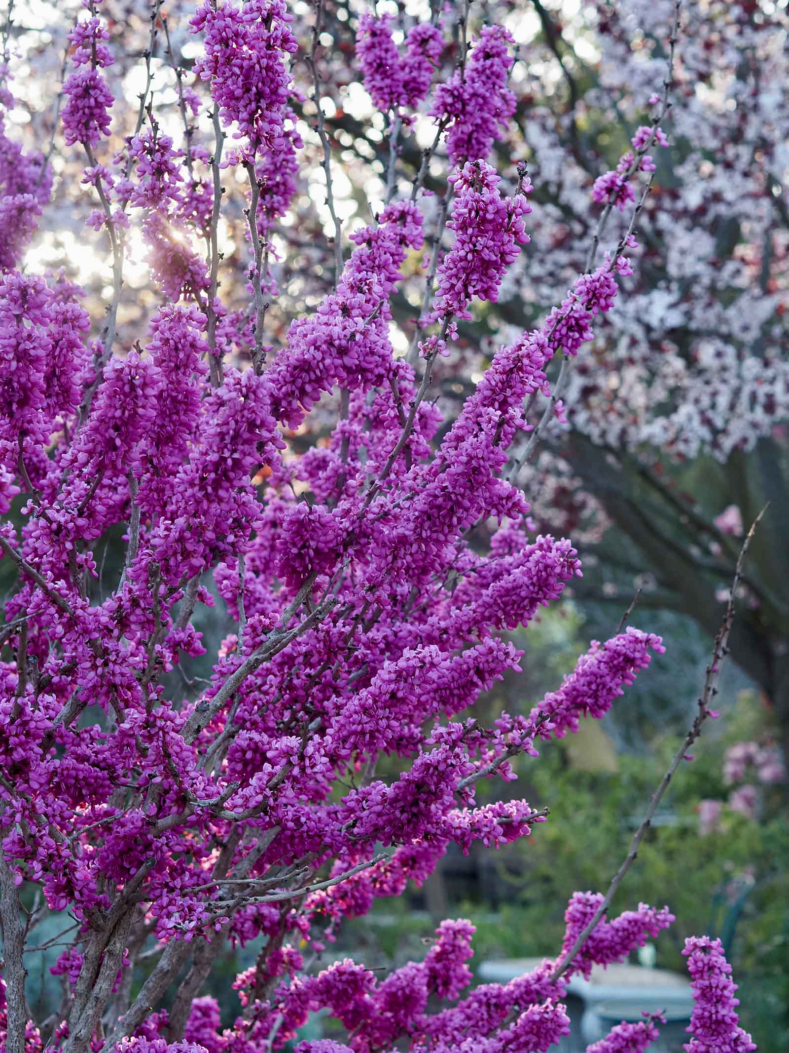 The earliest blooming of redbuds, its pink buds emerging from the bare branches in February, a full month before its eastern and western cousins. Branches tend to ascend and are cloaked densely with fuschia flowers, wands dipped into floral batter. Tender rounded leaves start emerging from the branch ends as the blooms mature and then fade, lending a distinctive two-tone effect to the branches. The leaves have pointed tips, like those of C. canadensis, but with 5, not 7, veins radiating from the base. The slender pods are scarce.