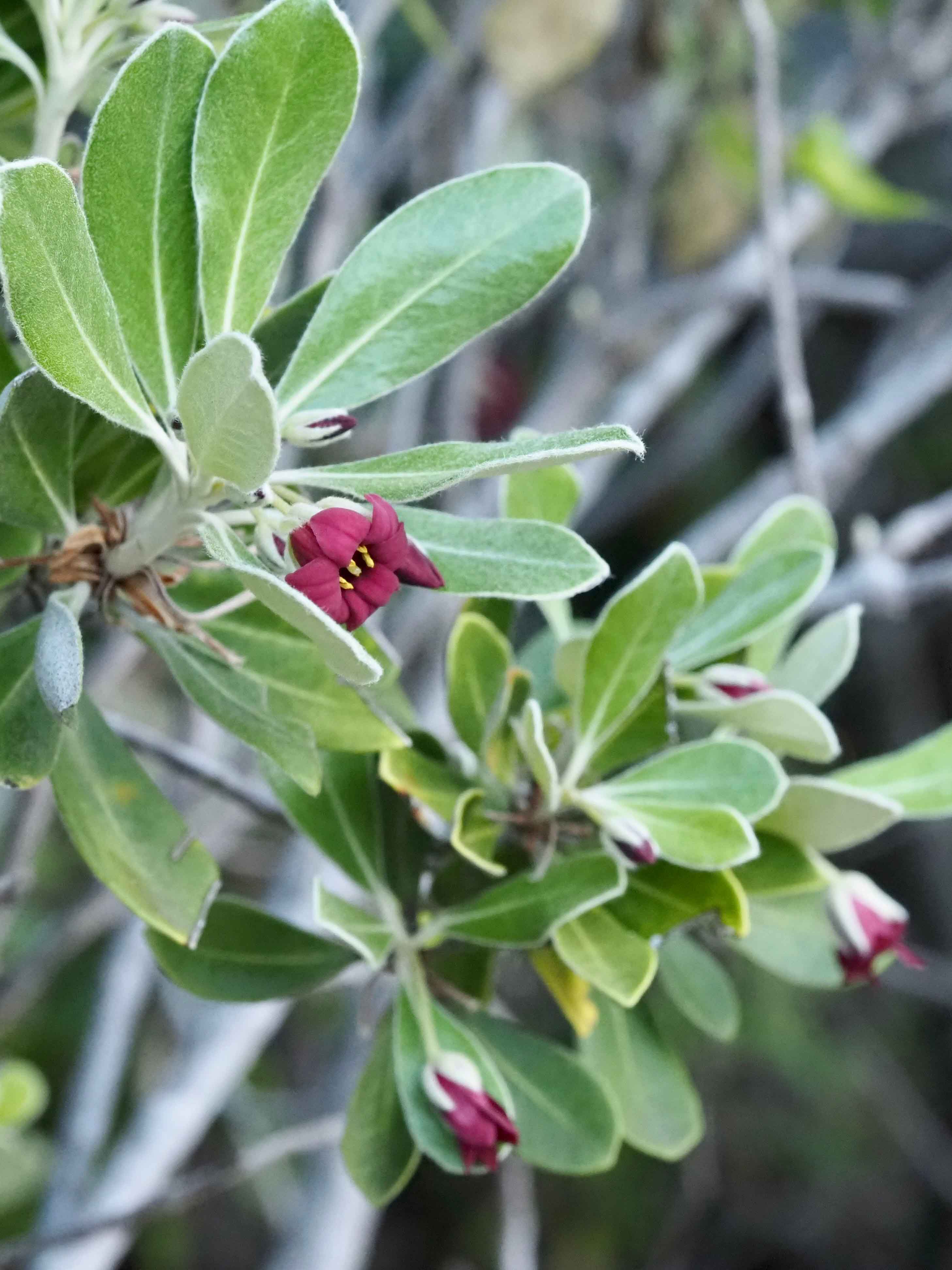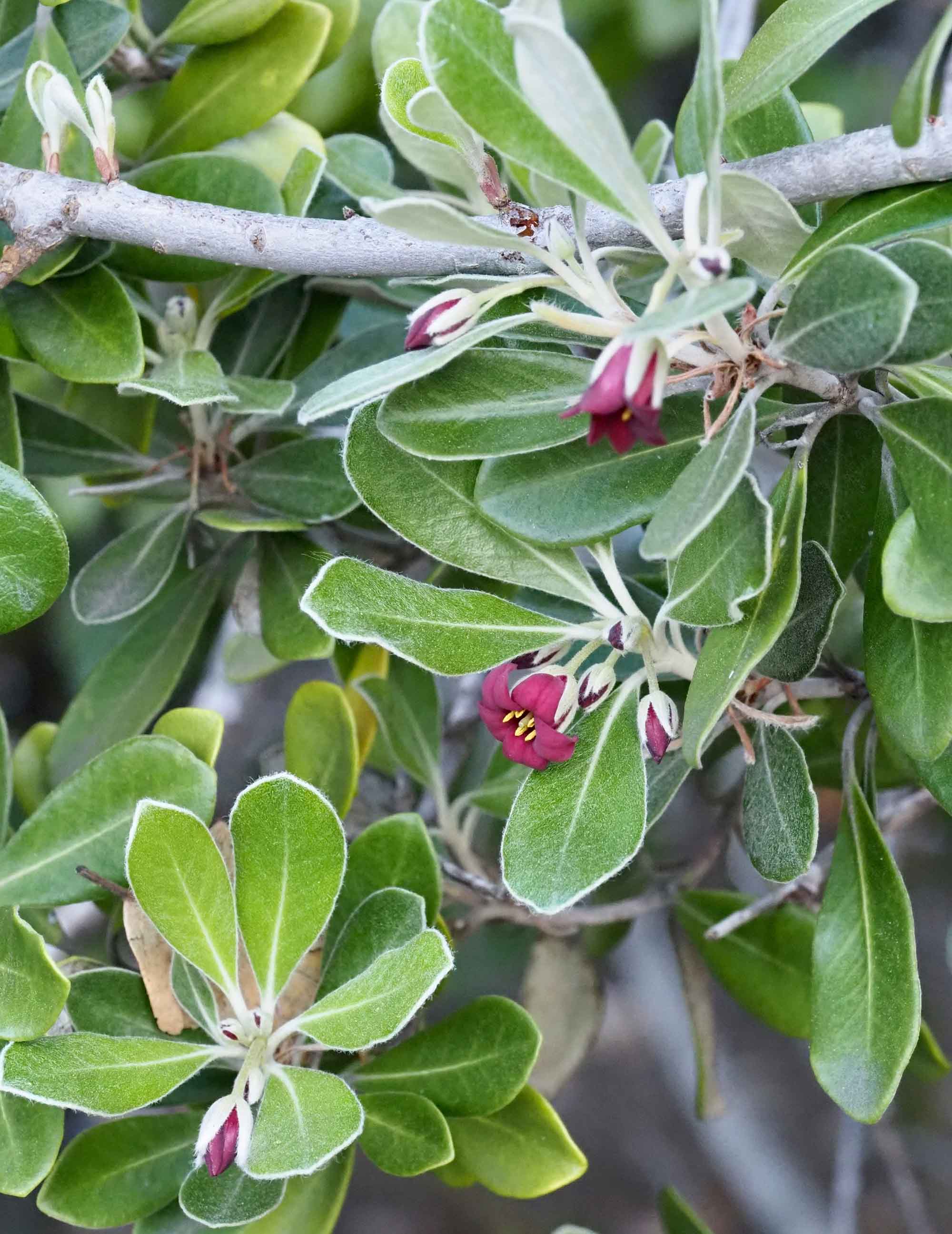A shrub or small tree with silvery gray appearance due to pale felted undersurfaces on the 2- to 4-inch leaves. Small deep magenta flowers occur in spring. It is not clear why important New Zealand trees that grow in San Francisco and Santa Cruz are poorly represented at Stanford; for example kauri (Agathis australis), kowhai (Sophora tetraptera), and rimu (Dacridium cupressinum).