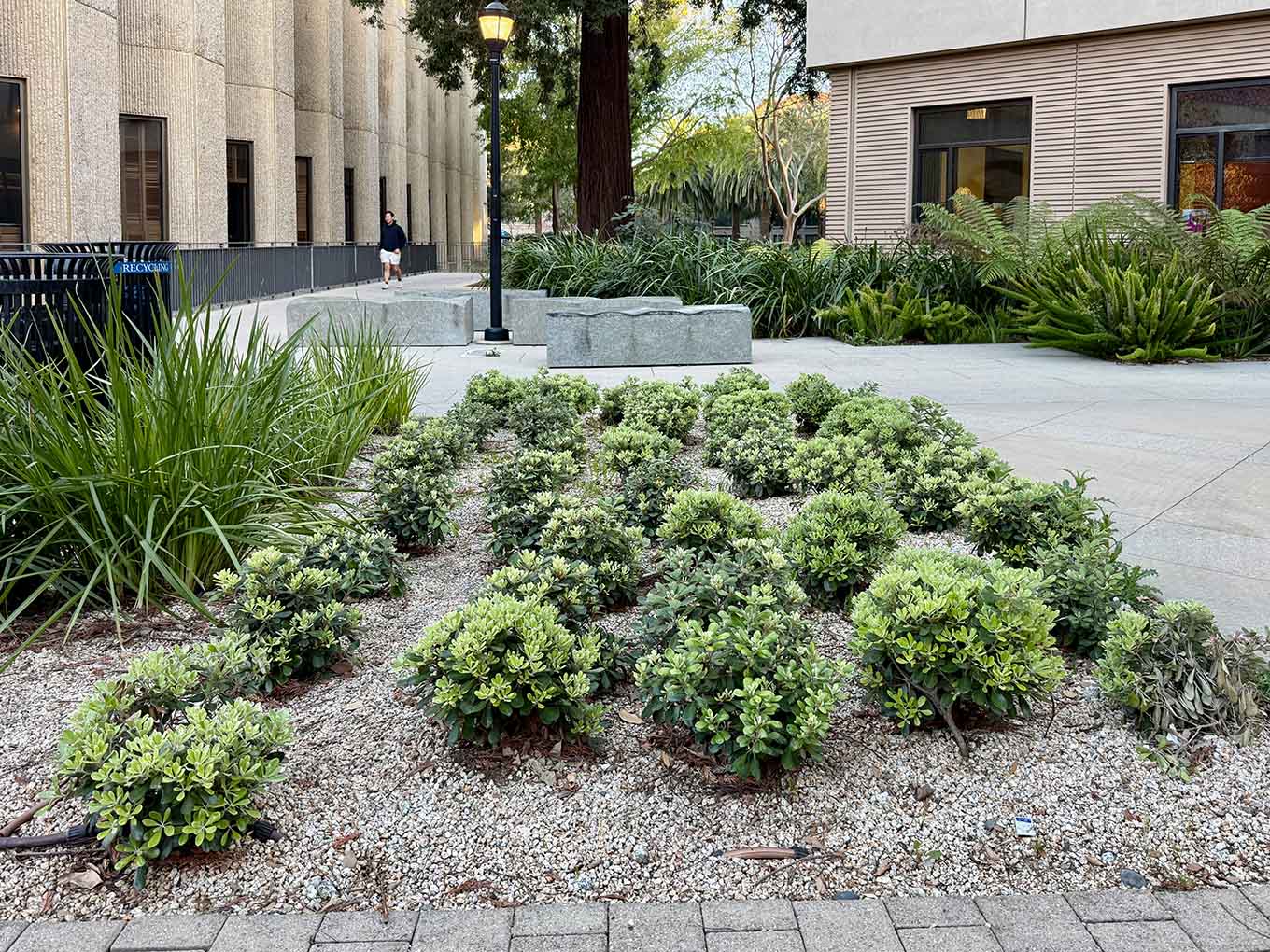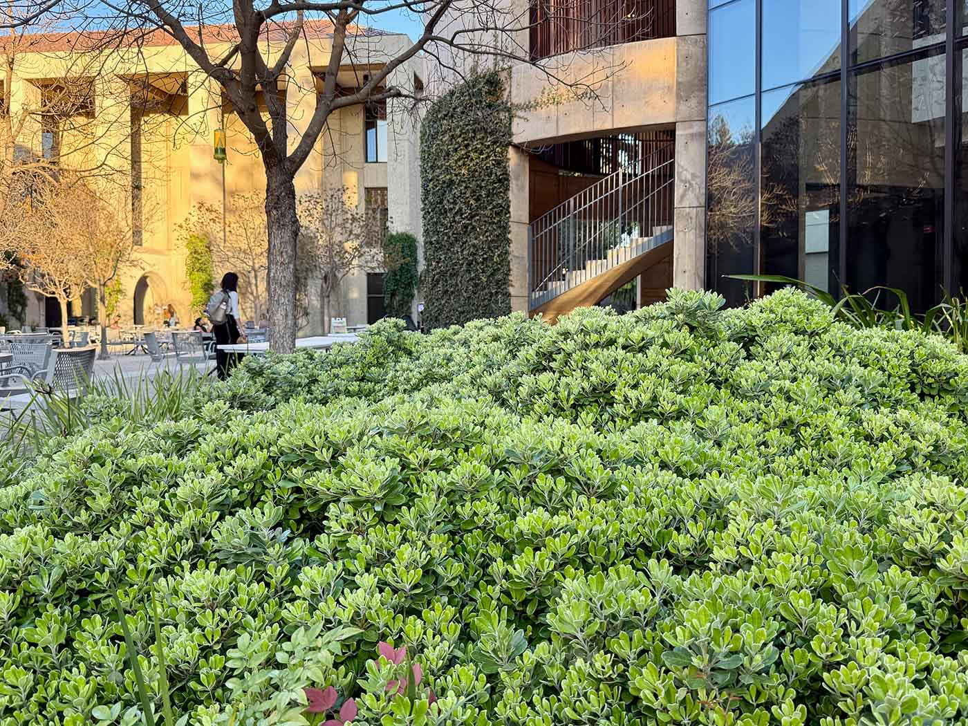 A trimmed hedge of karo separates Branner Hall’s front garden from the parking lot to the west. See two beds of the low-growing ‘Nana’ variety between the Law School and the William H. Neukom Building.
