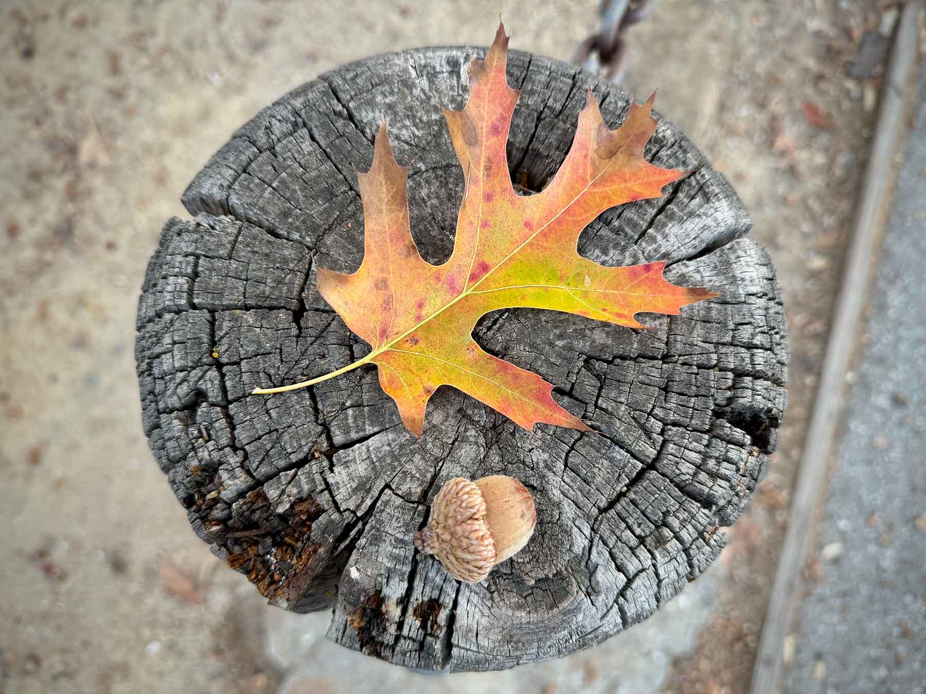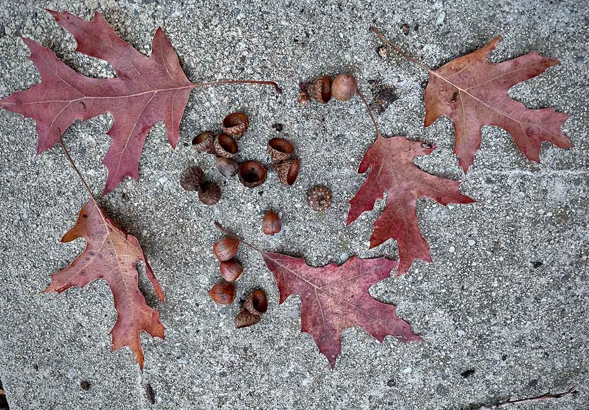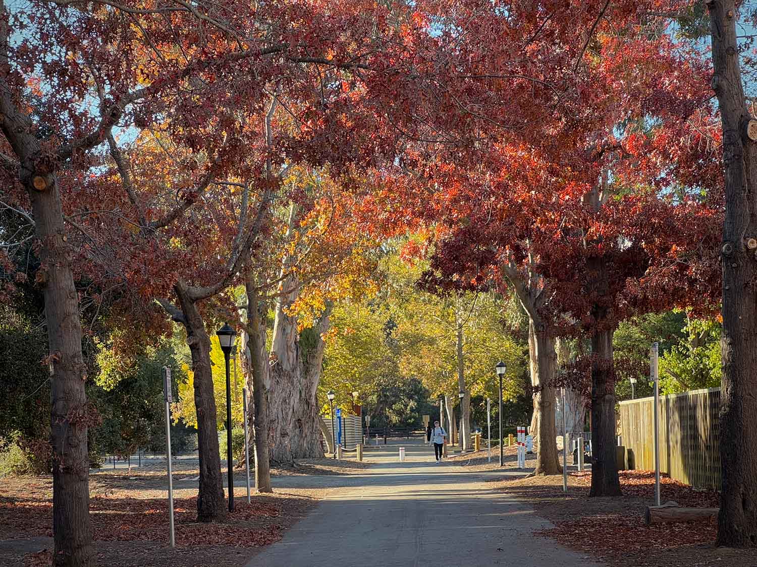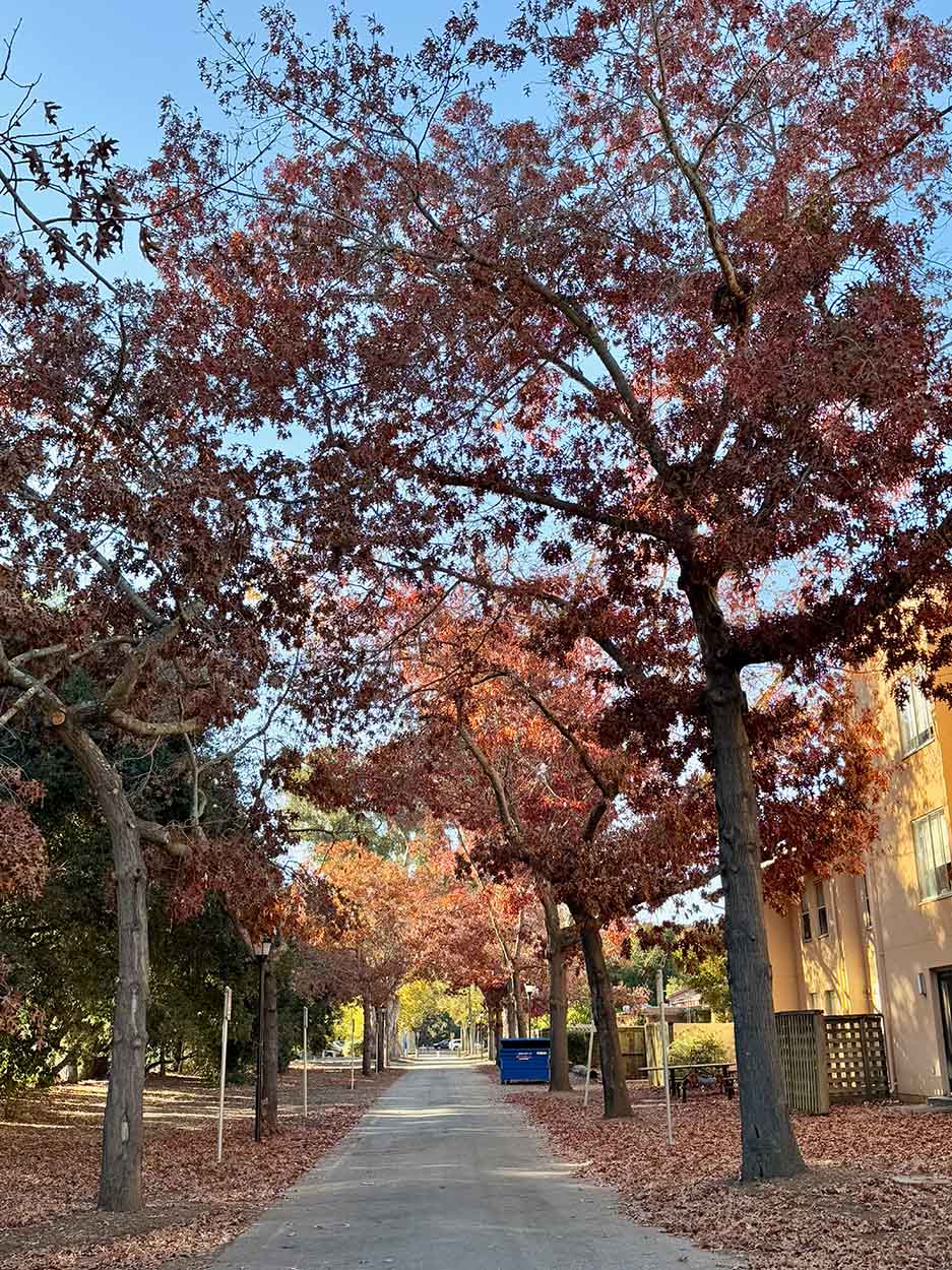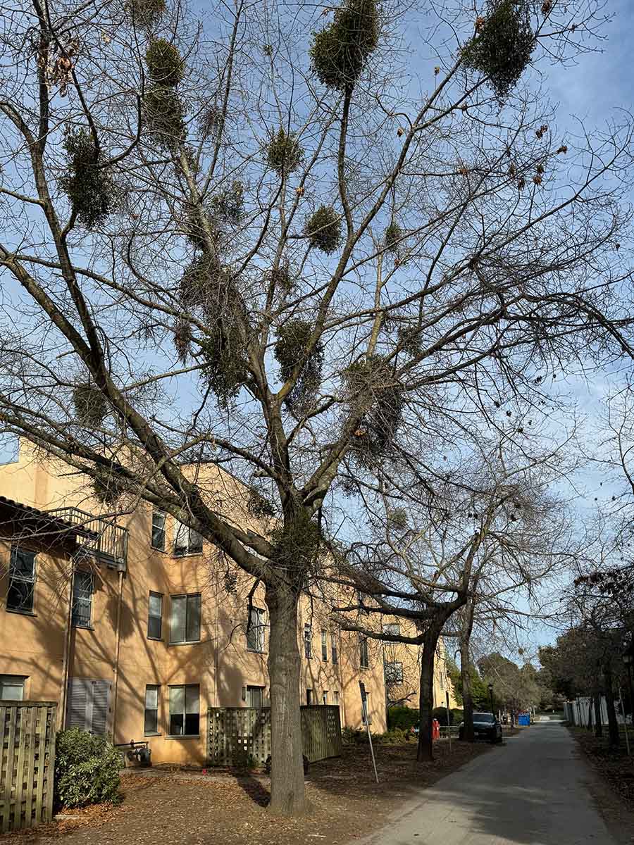 Governor’s Avenue South from Elliott Program Center toward Campus Drive is lined with scarlet oaks, some decked with clumps of mistletoe; once thought to be pin, their acorns and foliage confirm scarlet. More can be seen around the bend, at Murray and Yost Houses on Governor’s Avenue proper. Two youngsters grew for six years just west of the Stanford Wall sculpture in the east ear of the Oval (map pin), removed in 2024. A handsome Q. coccinea stands at 1610 Portola Avenue in Palo Alto.