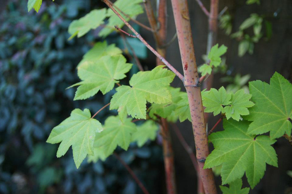 The cultivar ‘Pacific Fire’, found in a nearby garden, has orange-tinged yellowish fall color and coral-red branches and stems that fade to salmon – a California-native answer to the ubiquitous coralbark Japanese maple (A. palmatum ‘Sango-kaku’). Narrow-crowned and dwarf in stature, it tucks neatly against a fence when space is scarce. A larger vine maple, with yellow to scarlet autumn leaves, grows in the native-themed garden behind the Woodside Library.