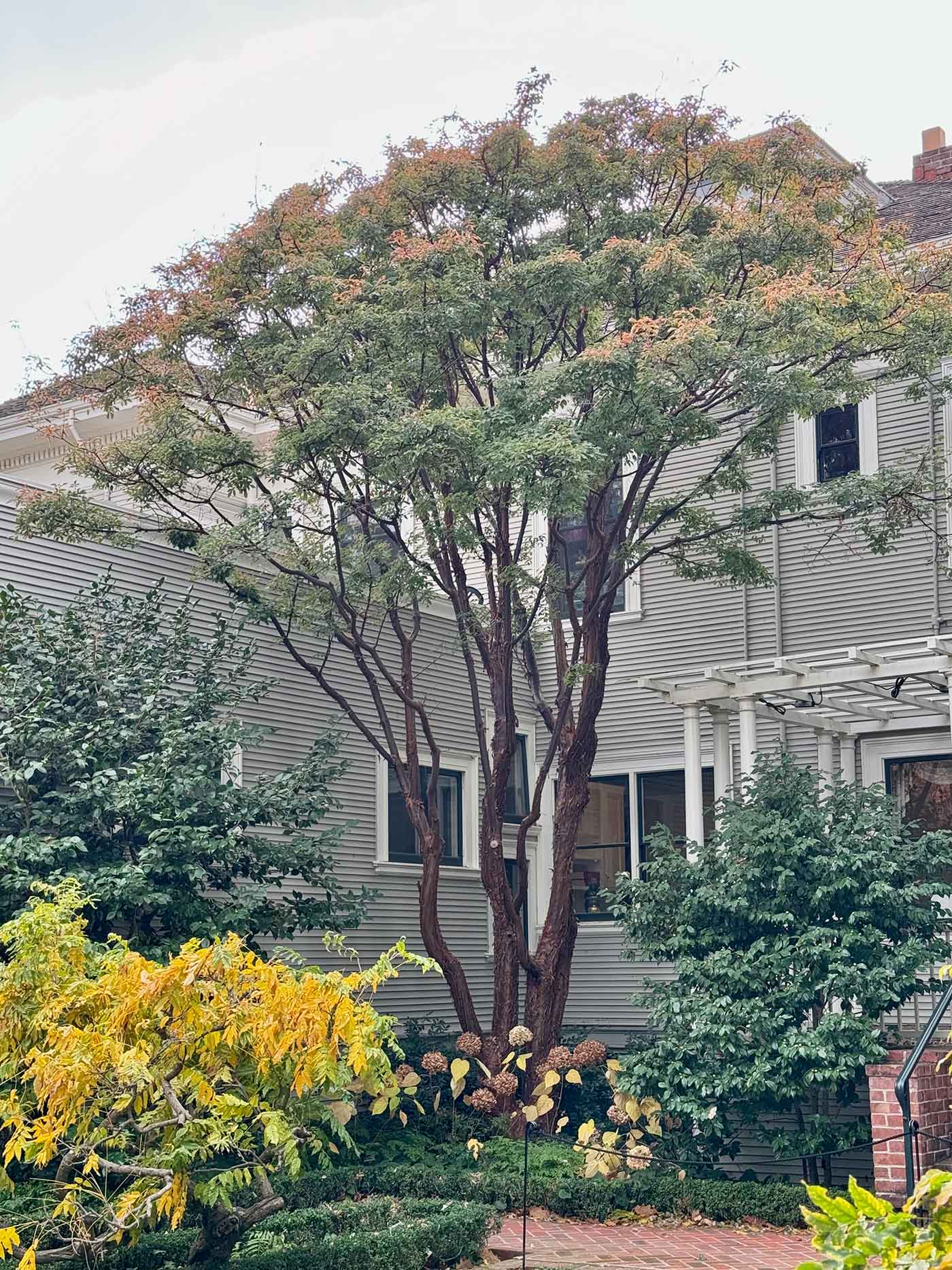 An unforgettable maple with orange-flecked bark that exfoliates even on the smallest twig, the effect greatly magnified on thicker trunks – which are rare around here. The leaves are trifoliate, like those of our native A. negundo, with a few rounded teeth. Their silvery undersides – griseum means gray – are particularly attractive in autumn, when the foliage on their rather sparse crowns turns a handsome scarlet.