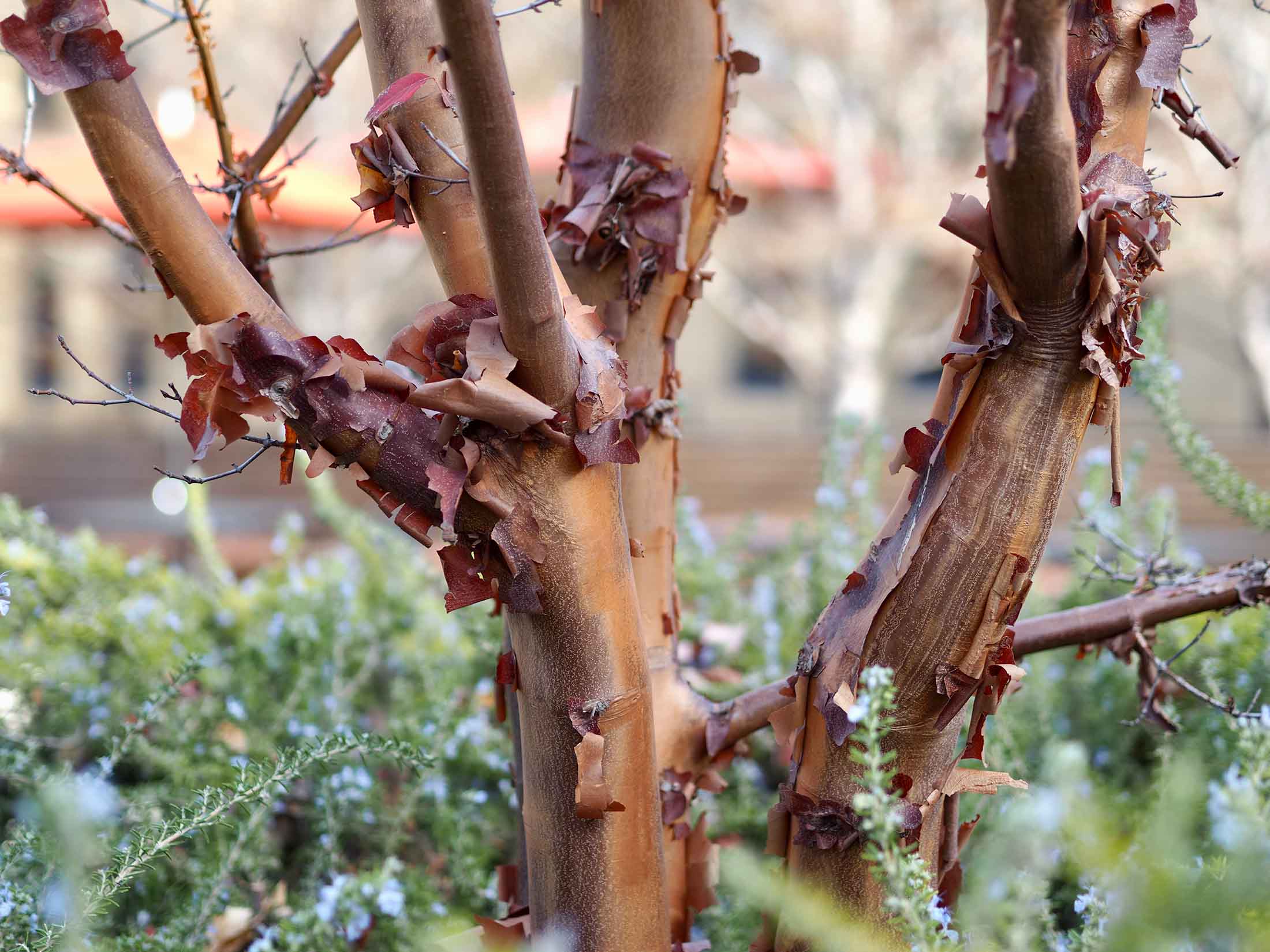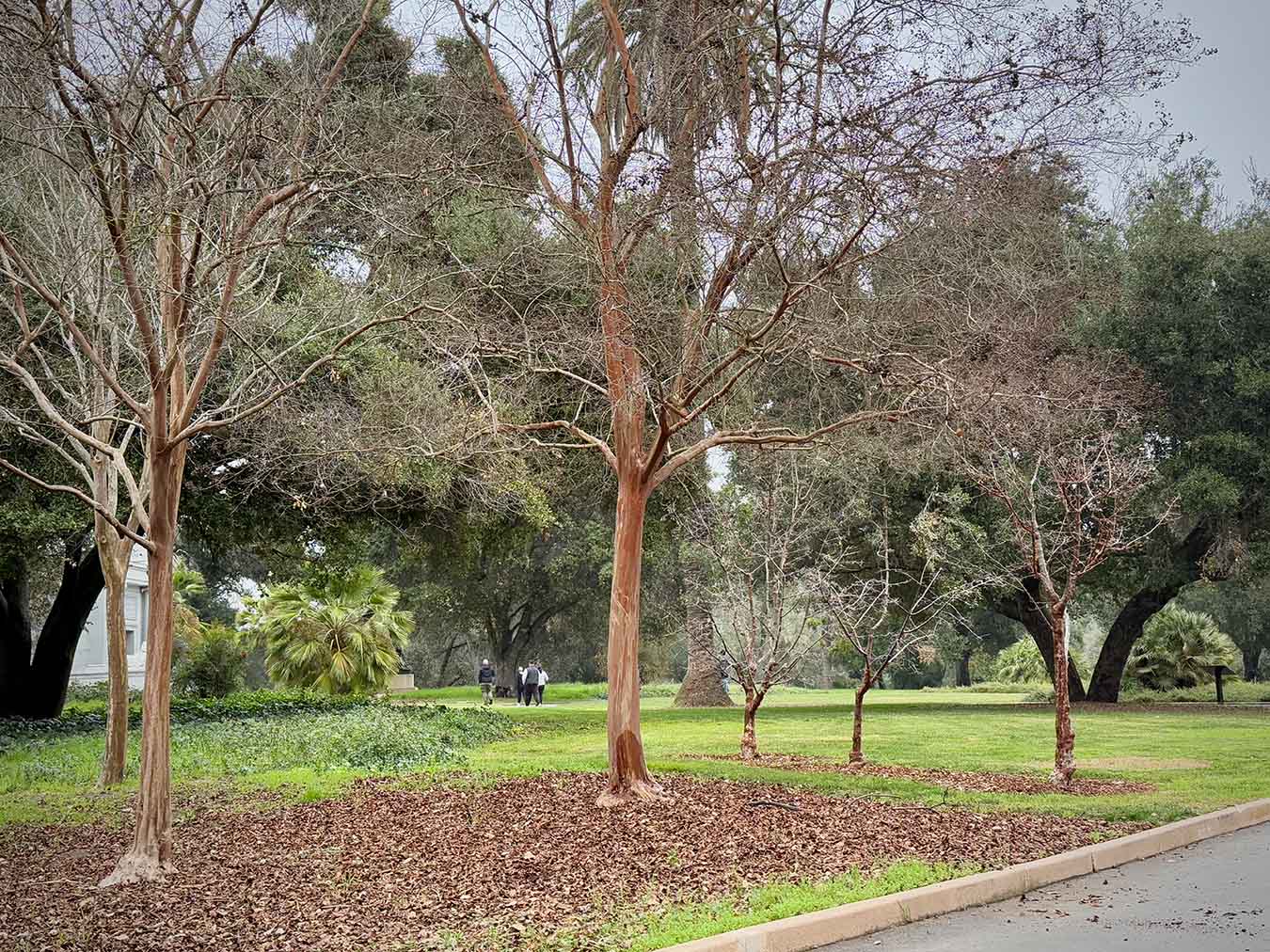 Campus’s handsomest specimen stands at the north corner of Lou Henry Hoover House. The region’s champion in both size and beauty is a multi-trunked tree on the left side of the back porch of Gamble Garden House in Palo Alto, planted in 1990 from a 20-inch box, replacing a straggly pineapple guava reaching for the sun. A few others are scattered around Palo Alto, the largest at 1520 Byron Street.