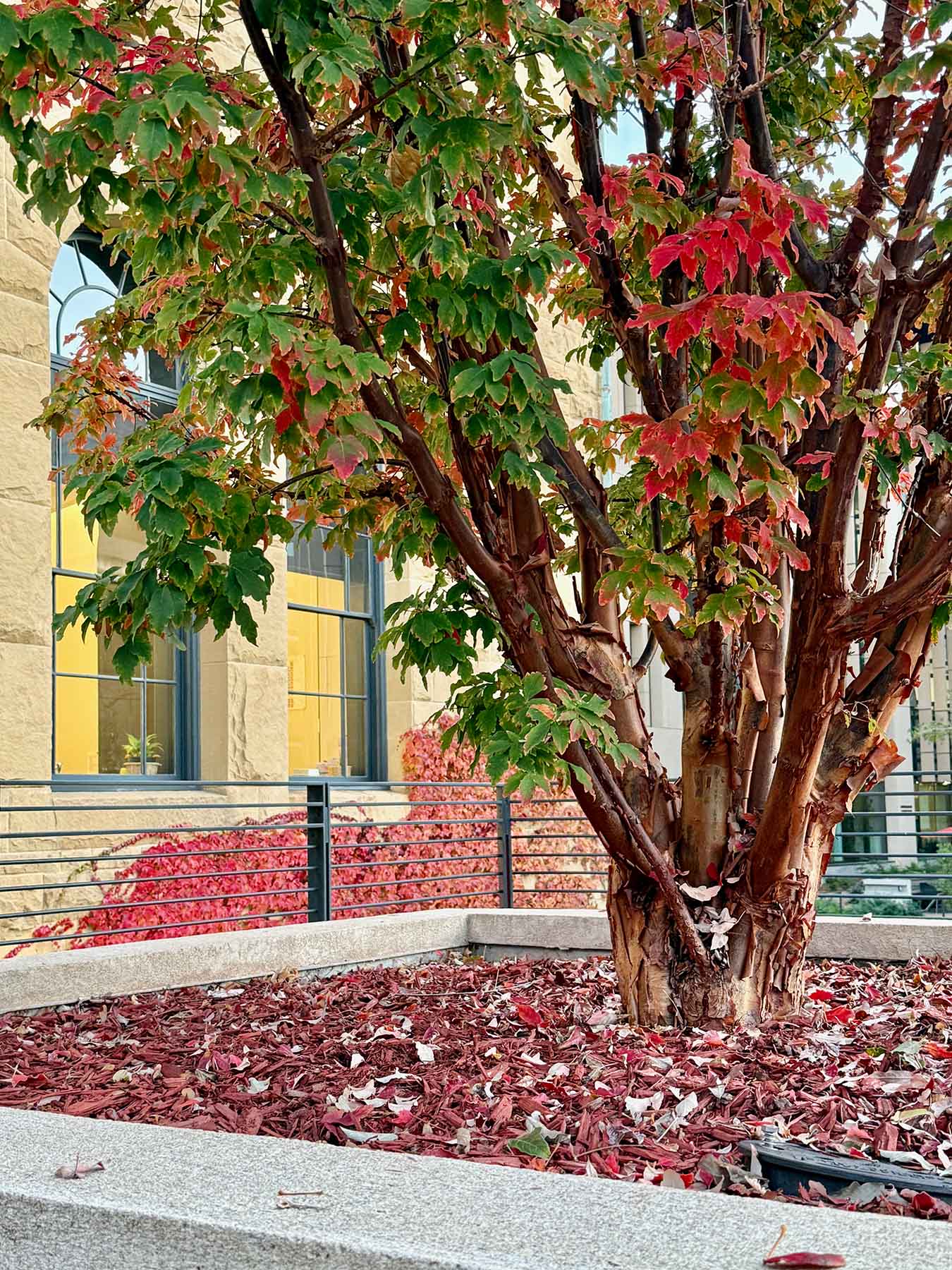 Rows of raised planters flanking the patio behind Old Chemistry feature multi-trunked specimens planted in 2016. Nine trees remain in the inner courtyard of Crothers Hall, near the building entrances, planted in 2010. Three older, stunted transplants endure in the lawn to the left of the Mausoleum, near the crape myrtles.