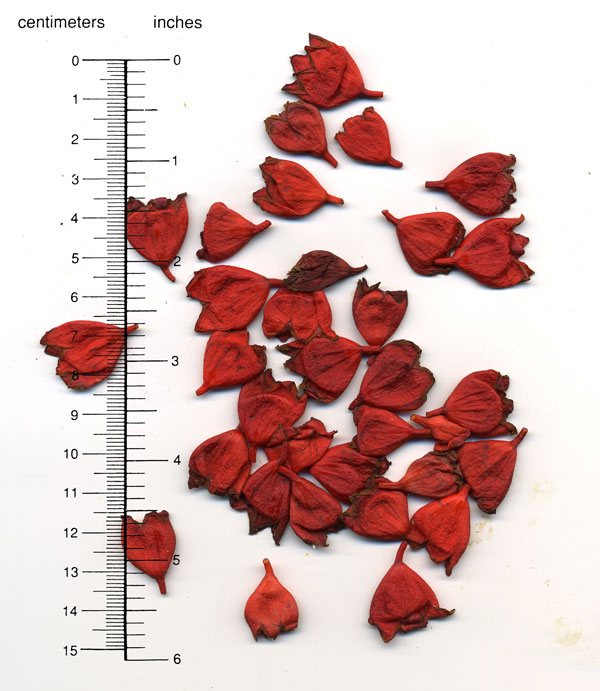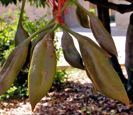 The leaves, large as your hand, are variously shaped, with 3–5 lobes or no lobes at all; the species name means with leaves like maple (Acer). Clusters of black, boat-shaped pods (follicles) dangle from the branches, each lined with seeds neatly arrayed in rows within.