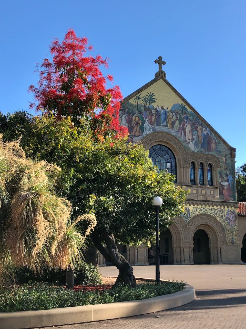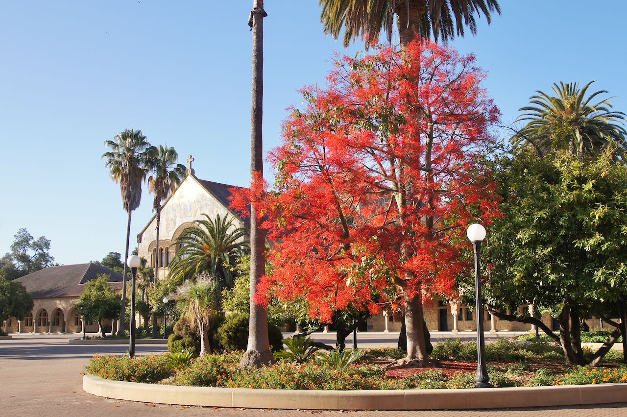 Glorious in bloom, aflame with clusters of small scarlet bells intensified by the shedding of surrounding leaves, the flame tree has been a presence in the Inner Quad since Stanford’s earliest days. One planted in the outer northwest island in 1890 flourished for more than a century, earning a spot on the cover of both The Stanford Magazine (Fall/Winter 1978) and Professor Ron Bracewell’s Trees of Stanford and Environs (2005). It was reported to flower in May and June. After its removal in 1998, a replacement was immediately planted in the same spot, and by 2003 had reached over 20 feet in height and 9 inches in diameter, blooming from late June into August. That same year, another was installed in front of the church, in the inner southeast island. It quickly rose through the canopy of neighboring trees, taking on a more spire-like habit than its sibling.