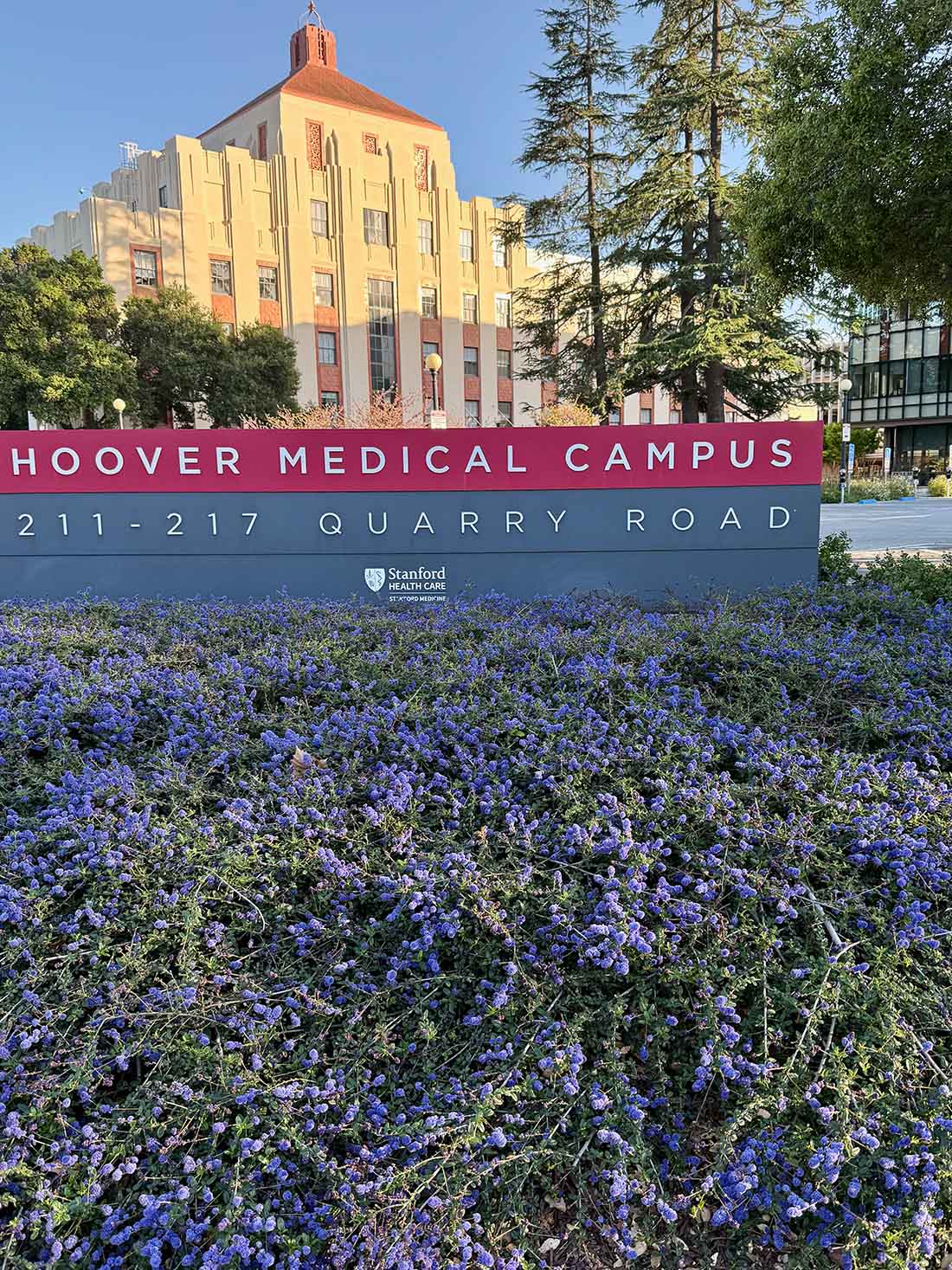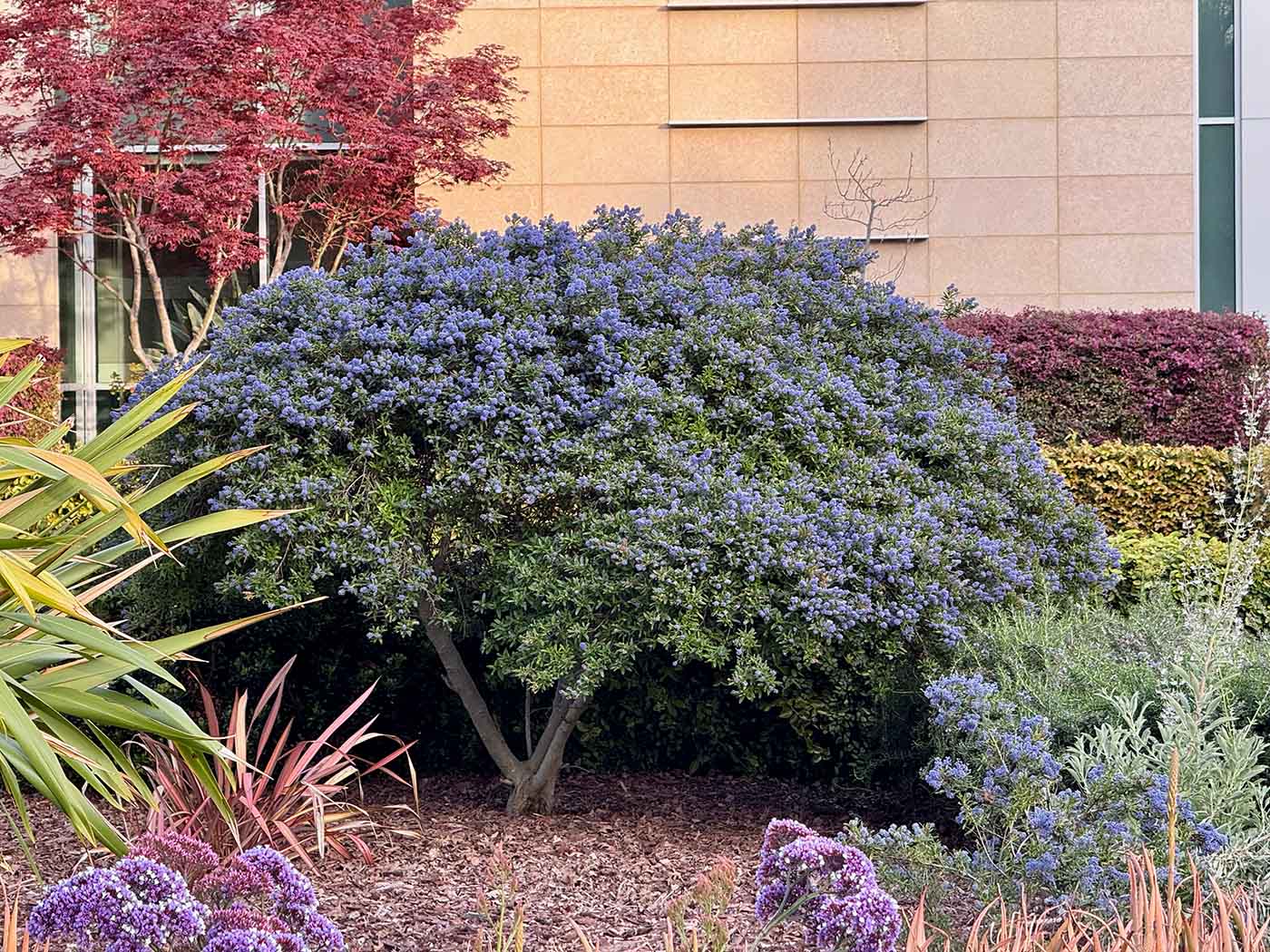 ‘Dark Star’, a hybrid of C. impressus and C. papillosus, is a dense shrub up to about 5 feet tall, with flowers of the richest cobalt blue. Tiny dark leaves show a quilted effect from the impressed veins. Campus’s largest is in front of 920 Mears Court; several more are on the right of the driveway. Examples surround the bike parking on the right side of 780 Welch Road. Several line the parking strip on Stanford Avenue near the Dish entrance. ‘Concha’ is another hybrid selection of similar size; find it at 975 California Avenue.