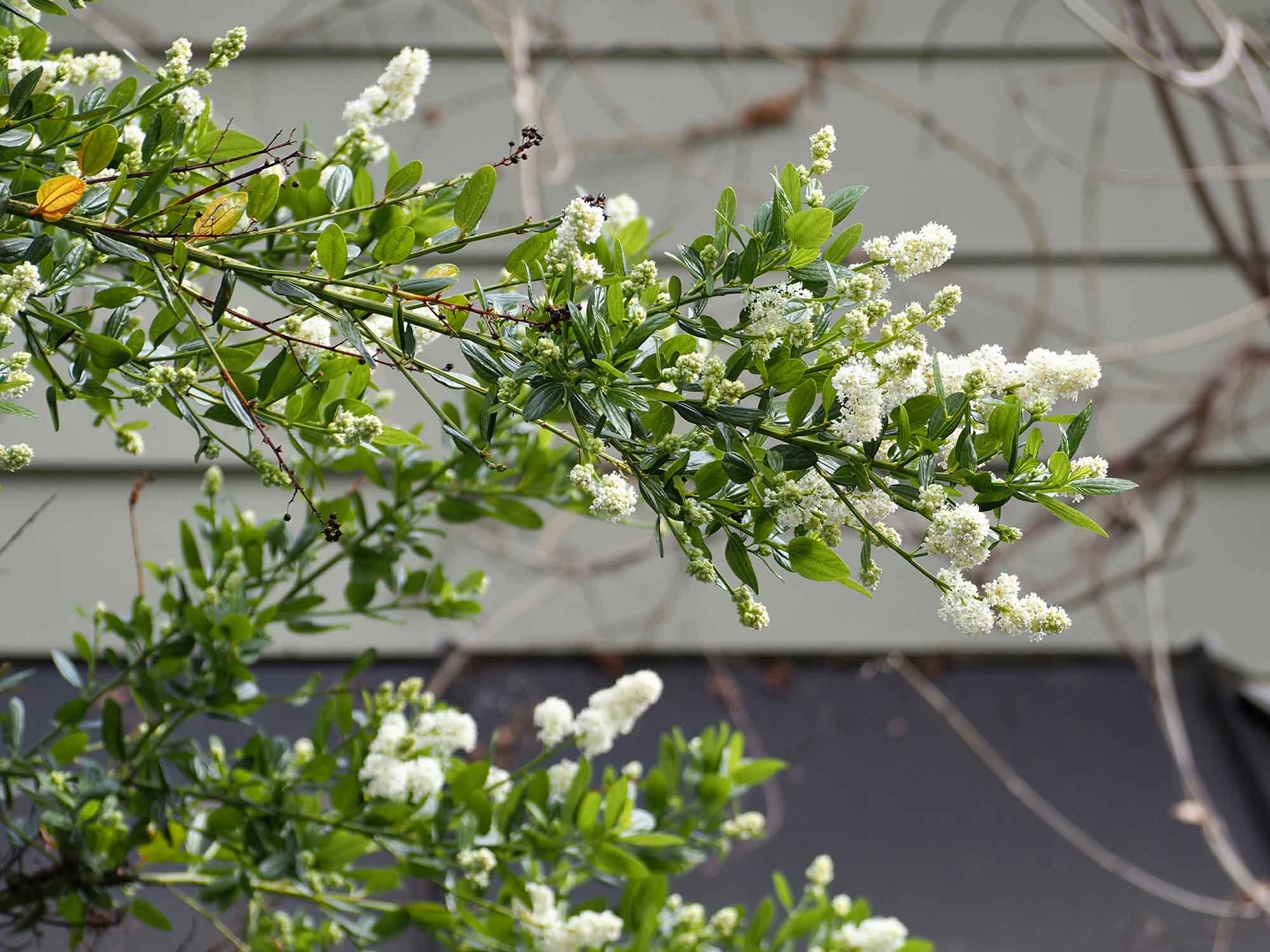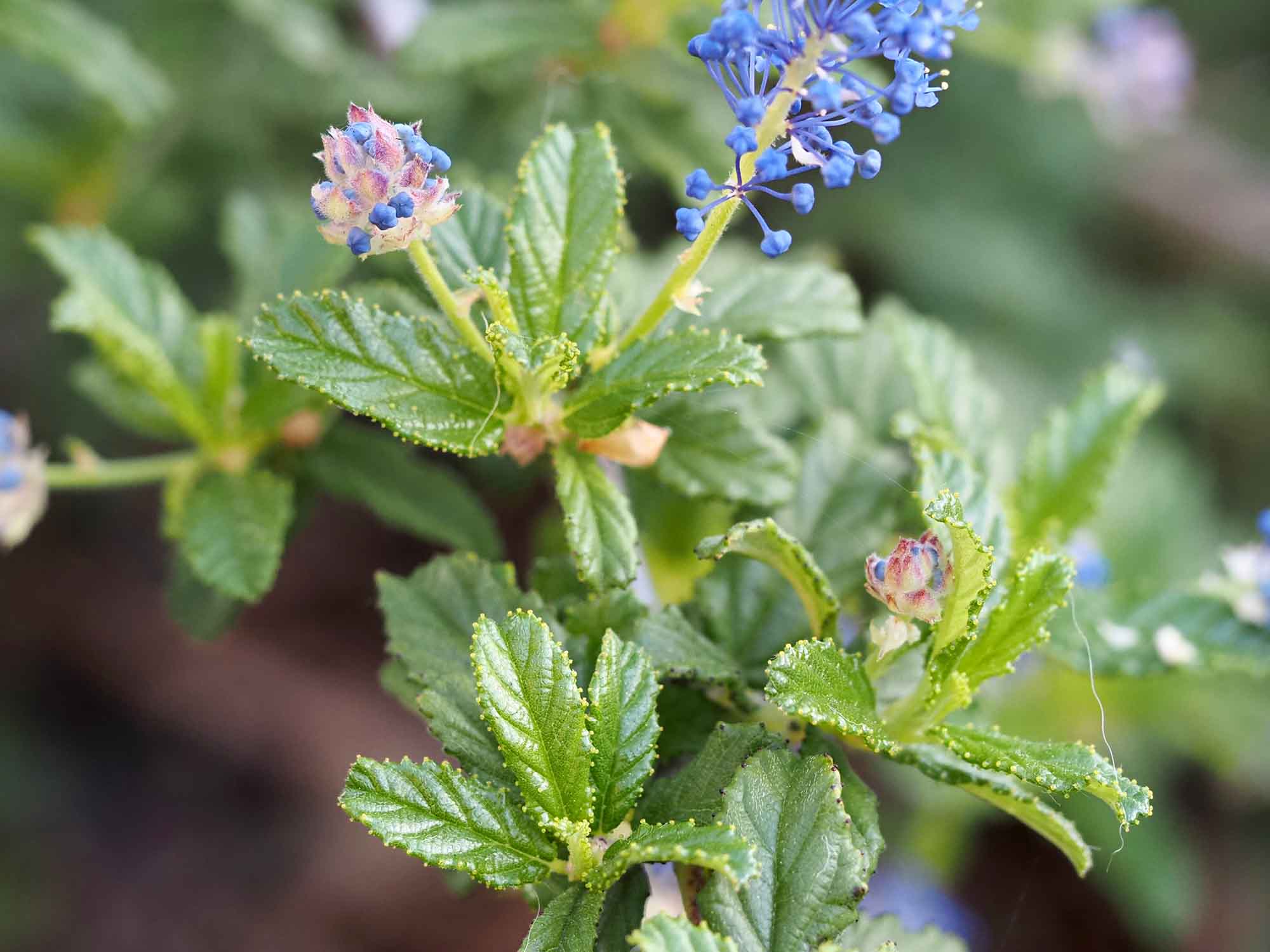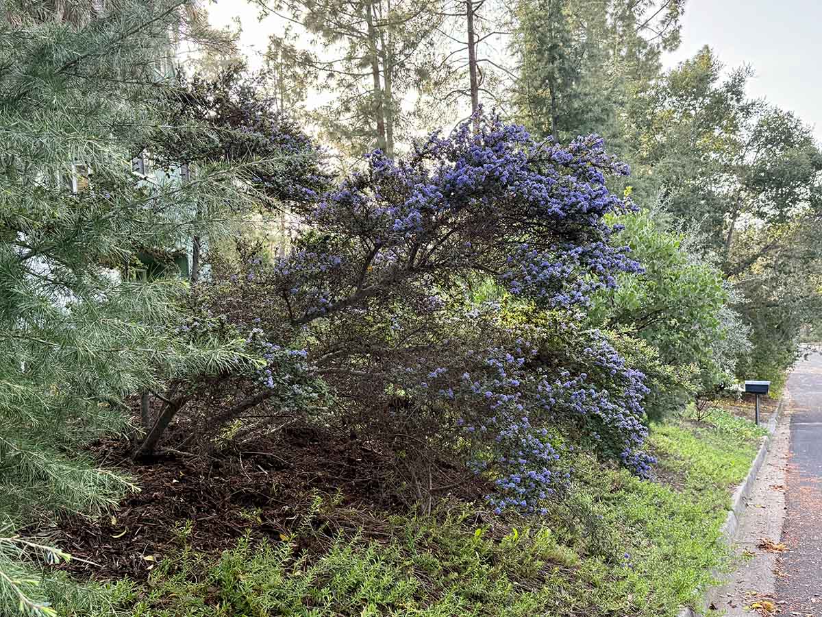 ‘Joyce Coulter’, a low spreading shrub with small, dark green leaves and deep blue flowers, can be seen on Arguello Way just south of Buckeye Lane. ‘Centennial’, another low groundcover, is mounded around the sign on the south corner of Quarry Road and Palo Road. C. maritimus ‘Valley Violet’ is the smallest of our cultivated ceanothus, with tiny oppositely-arranged leaves; see it on Cottrell Way, on the left at 957 and on the right of the driveway at 908.