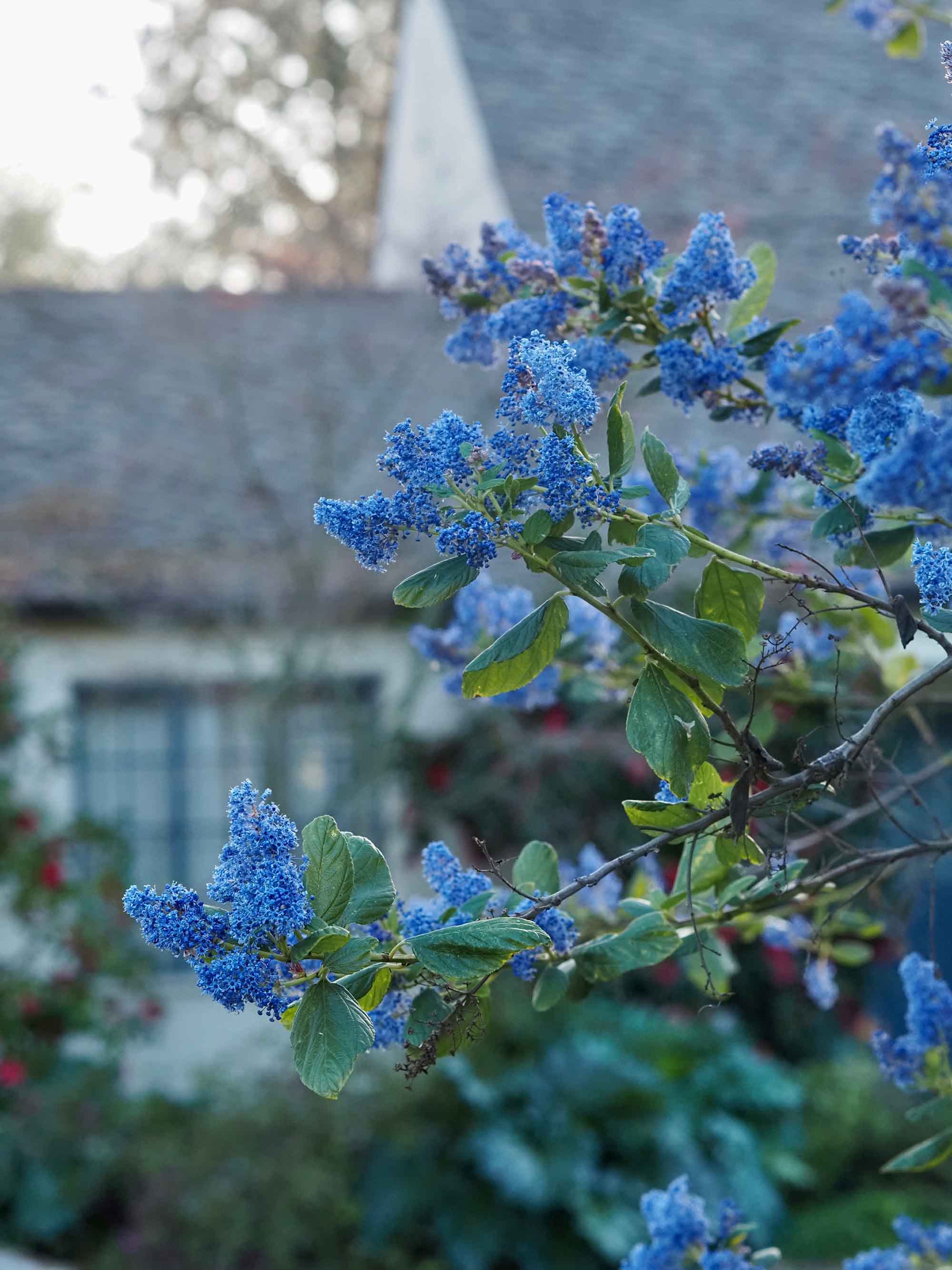 ‘Ray Hartman’, a hybrid of C. arboreus and C. thyrsiflorus var. griseus is the most popular tree form, with flowers of bluebird blue and glossy elliptical green leaves with paler undersides and three distinct veins rising from the base. See it along Salvatierra Street: on the right at 593, on the left at 708, and as a row of upright street trees at 635, a first for campus. Two young plantings are on the right at 1117 California Avenue in the Stanford Research Park (2025).