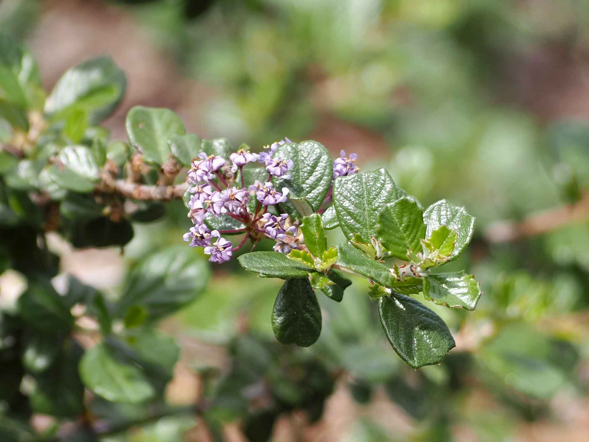 White-flowered buckbrush (C. cuneatus var. cuneatus) and the very pale blue–flowered Jim brush (C. oliganthus var. sorediatus) are native to Jasper Ridge; neither is planted on main campus.
