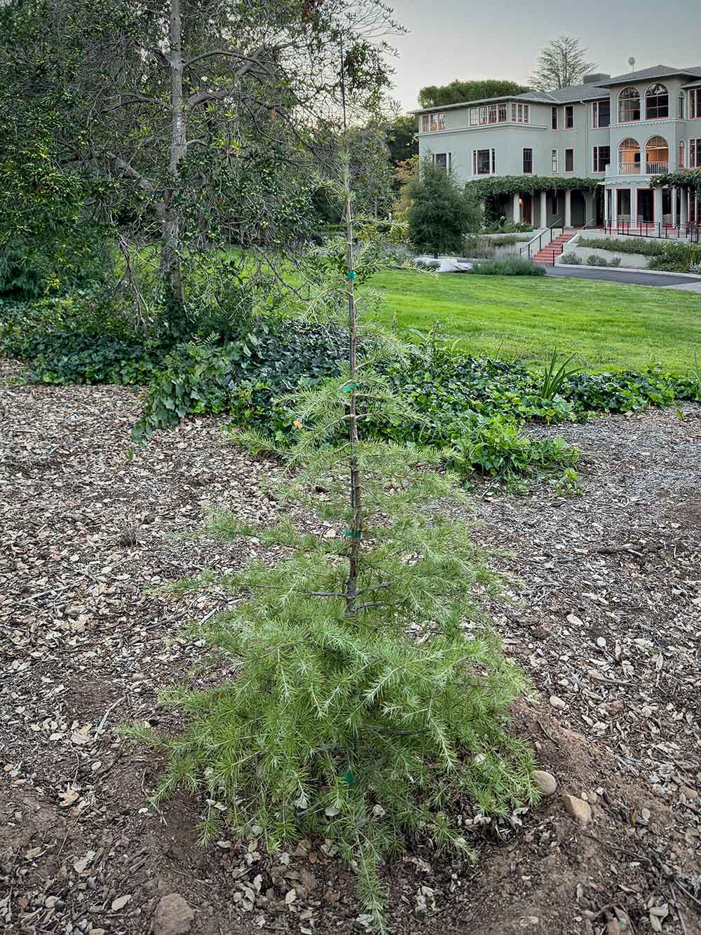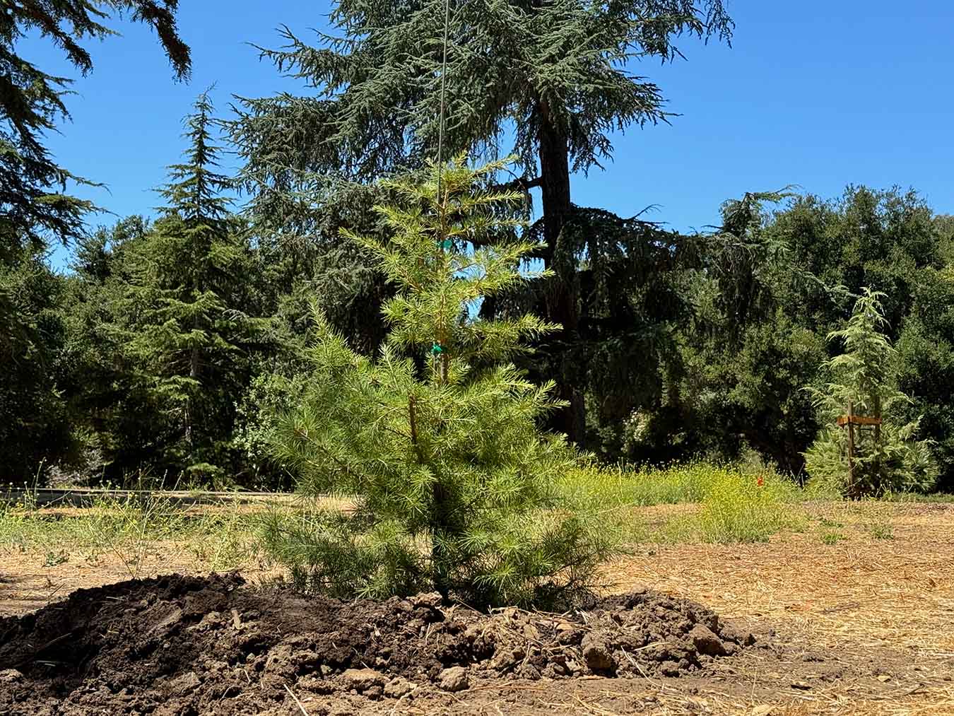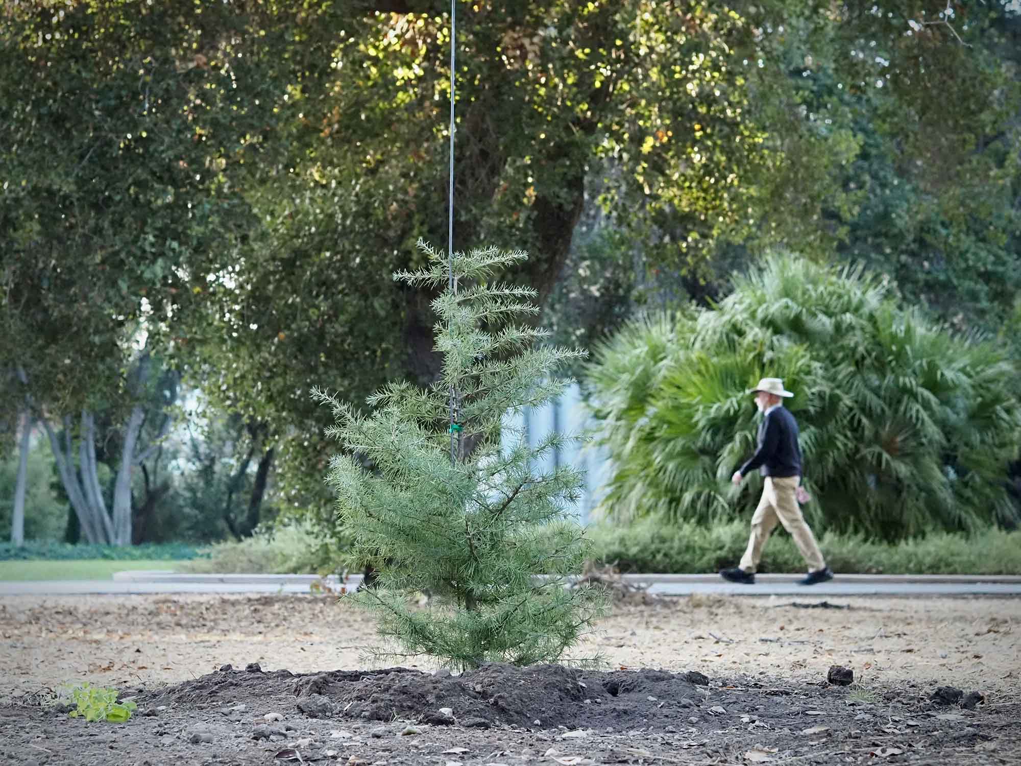 The name comes from Mount Lebanon (the Semitic root means “white,” a likely allusion to its snowy peaks), though the cedar is more abundant in Turkey. Stanford’s young pair came from seed collected in an indigenous stand of some 500 trees in Turkey’s Taurus range near Arslanköy (4,840 feet elevation). They were planted in 2024 at about three feet in height: one near the east corner of Pine Avenue at the circular path around the Mausoleum, the other near the southeast corner of Kingscote Gardens, just off Lagunita Drive.