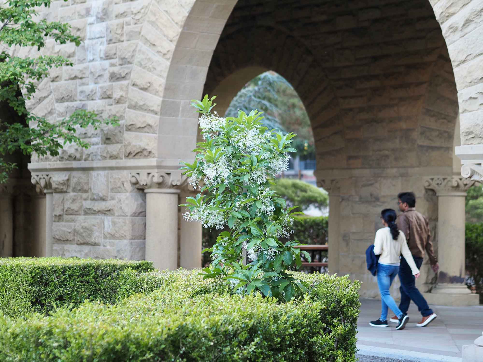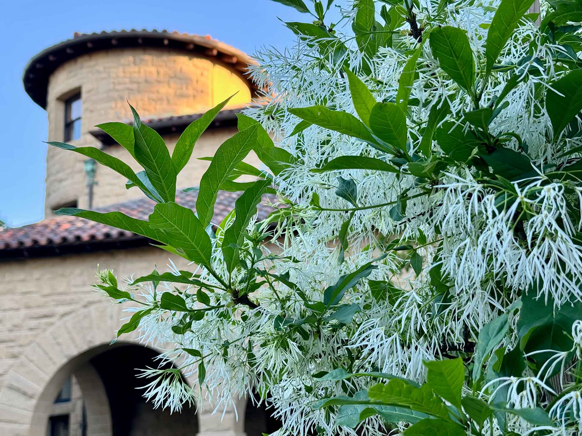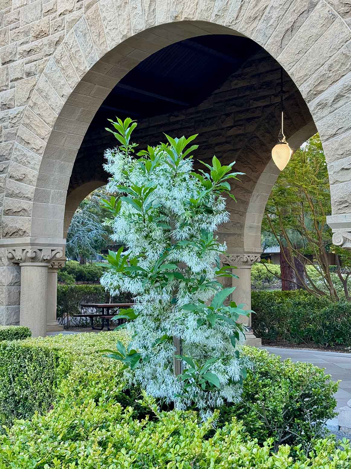 - 28 Feb 2000. Cardinal Chronicle: Thomas Church. Stanford Report. “In late spring, Chinese fringe trees blossom into a spectacular show of white flowers in Geology Courtyard behind Building 320.”