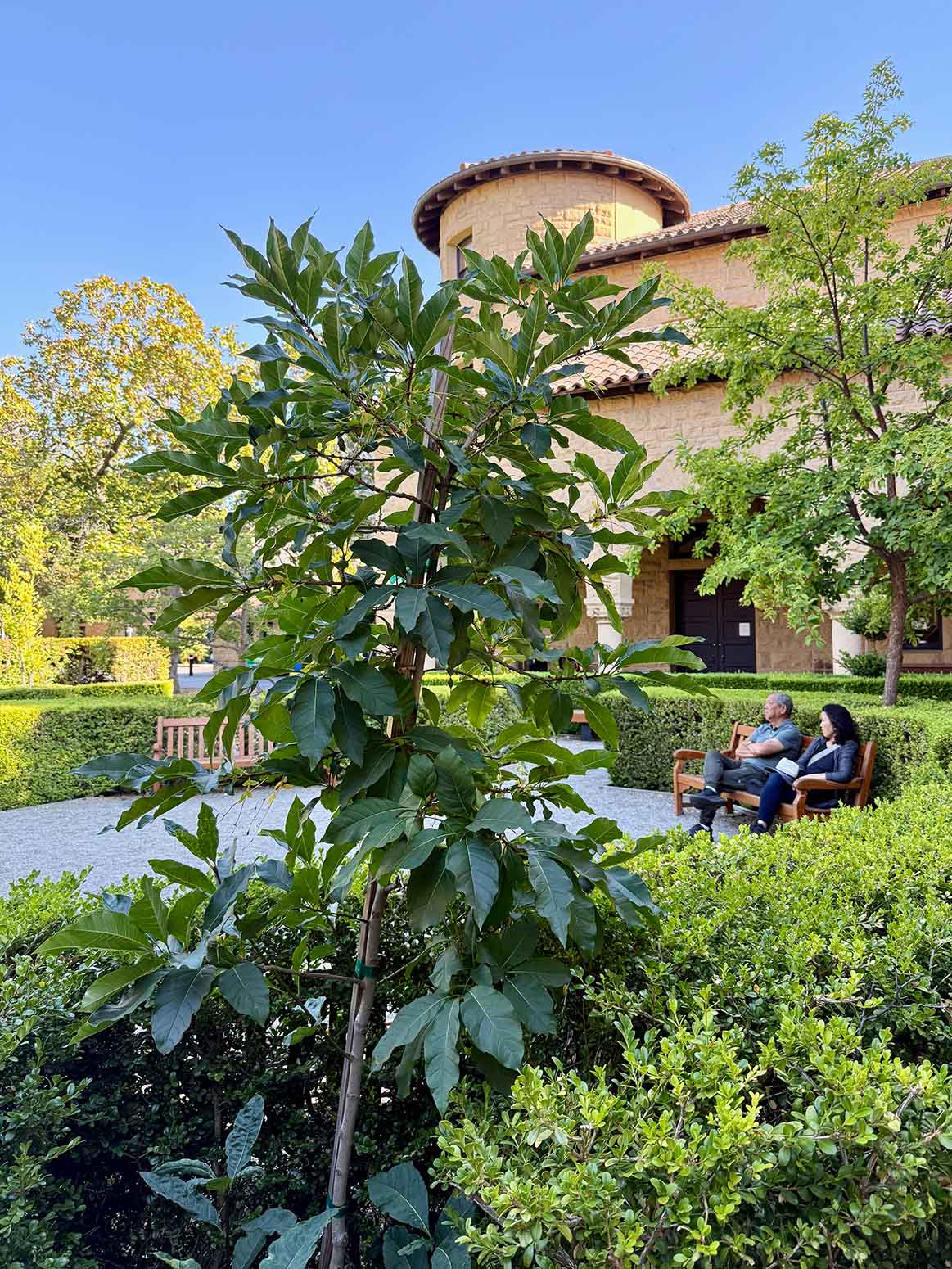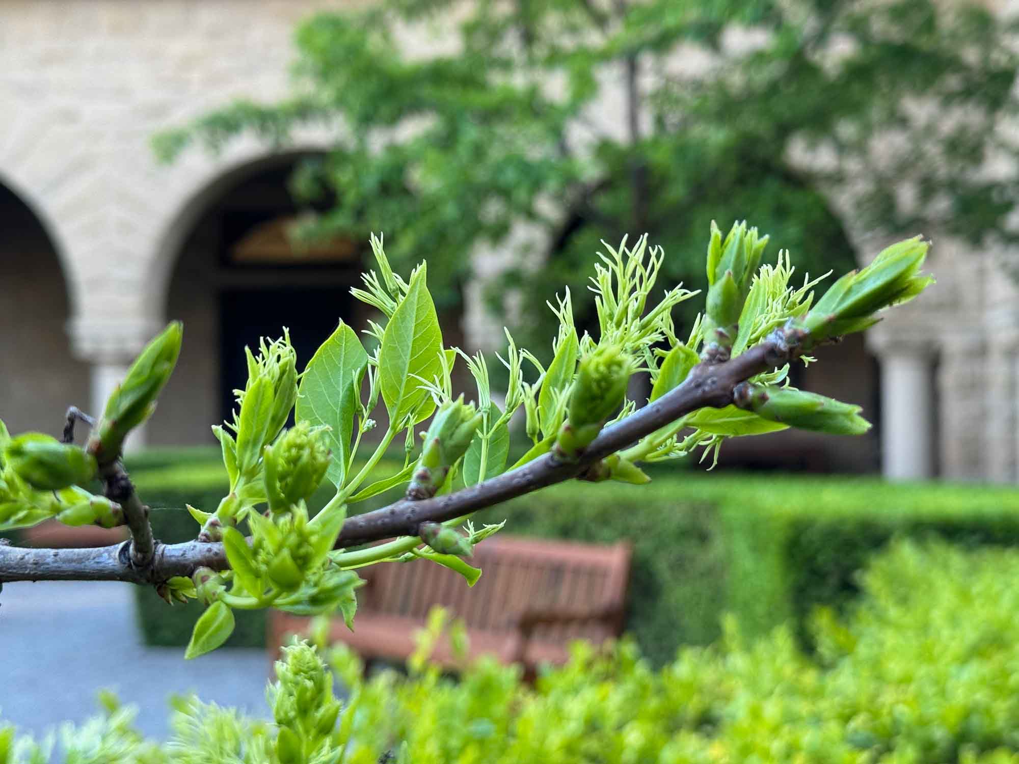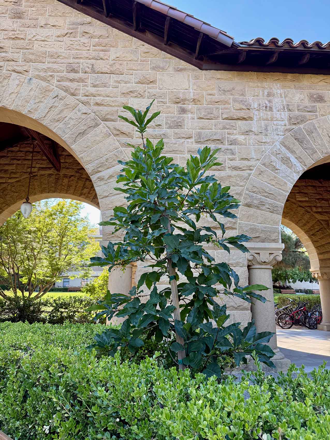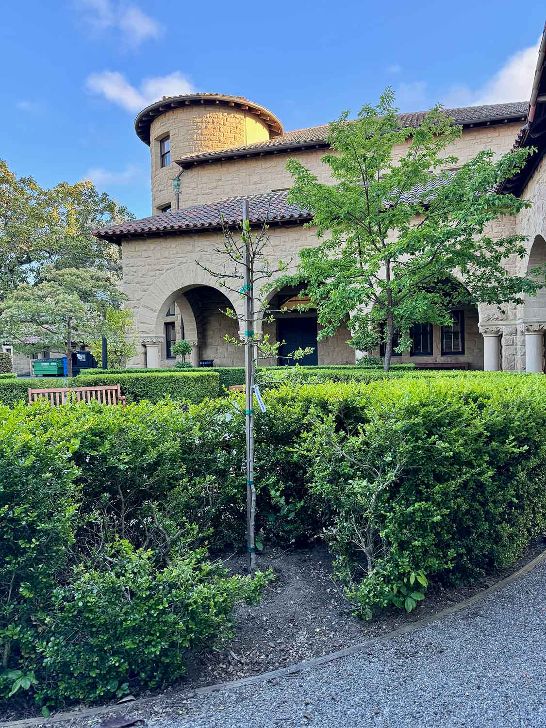 Campus’s sole specimen is a sapling planted in 2024 in the Thomas Church Garden, the courtyard just north of Geology Corner. This is the species called for in landscape architect Church’s original 1967 plan, though its more popular Asian ally C. retusus has been used in its place for the past few decades, three of which remain there and serve as a convenient comparison. In 2011, a historical restoration of the courtyard involved replacing other plant material, furnishings, and pavement details to match those originally specified by Church – including the three-tiered “poodle” style topiaries of Texas privet.
