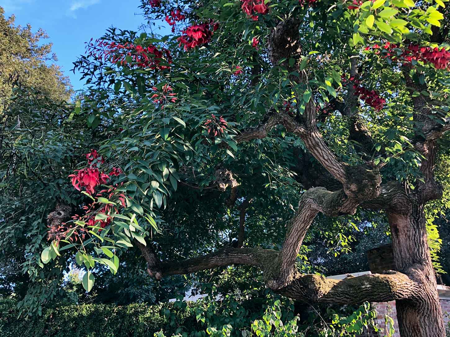This coral tree is the most cold-tolerant in its genus. Still, the one on the north corner of the Tea House at Gamble Garden in Palo Alto – likely planted in the 1970s or earlier – suffered from the deep freeze of 1990, and has since been maintained pollarded, with its branch ends swelling into knobby clubs. This annual removal of unsightly dead shoots, combined with its profusion of blooms and striking placement in the garden, makes this the most magnificent specimen in the area. Other fine examples are at 690 Waverley Street, Palo Alto, at the intersection with Forest Avenue, and at 740 University Drive in Menlo Park, on the right.