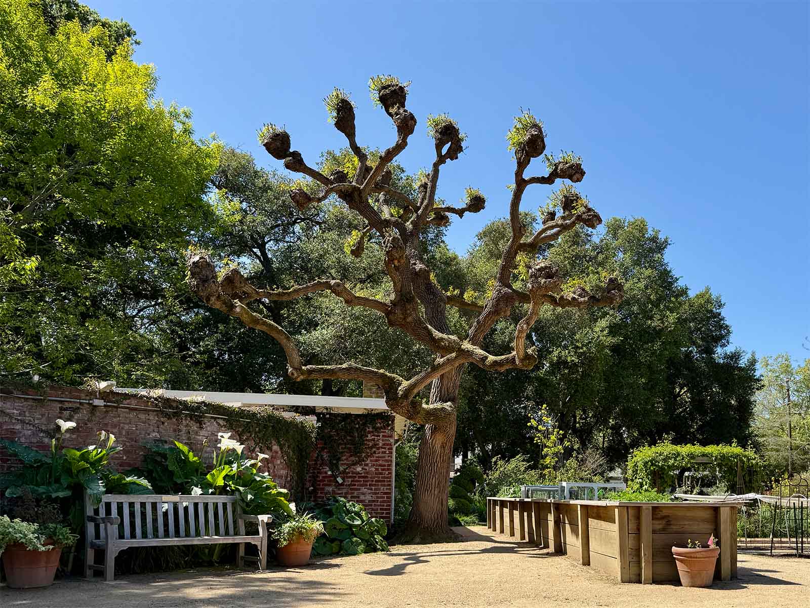 The only example on campus, a small tree in the bed northwest of the large tree yucca in the center of the Arizona Garden, has sadly declined. Given that this species blooms at Commencement time, and in Stanford’s official color, further plantings on campus would be well warranted.