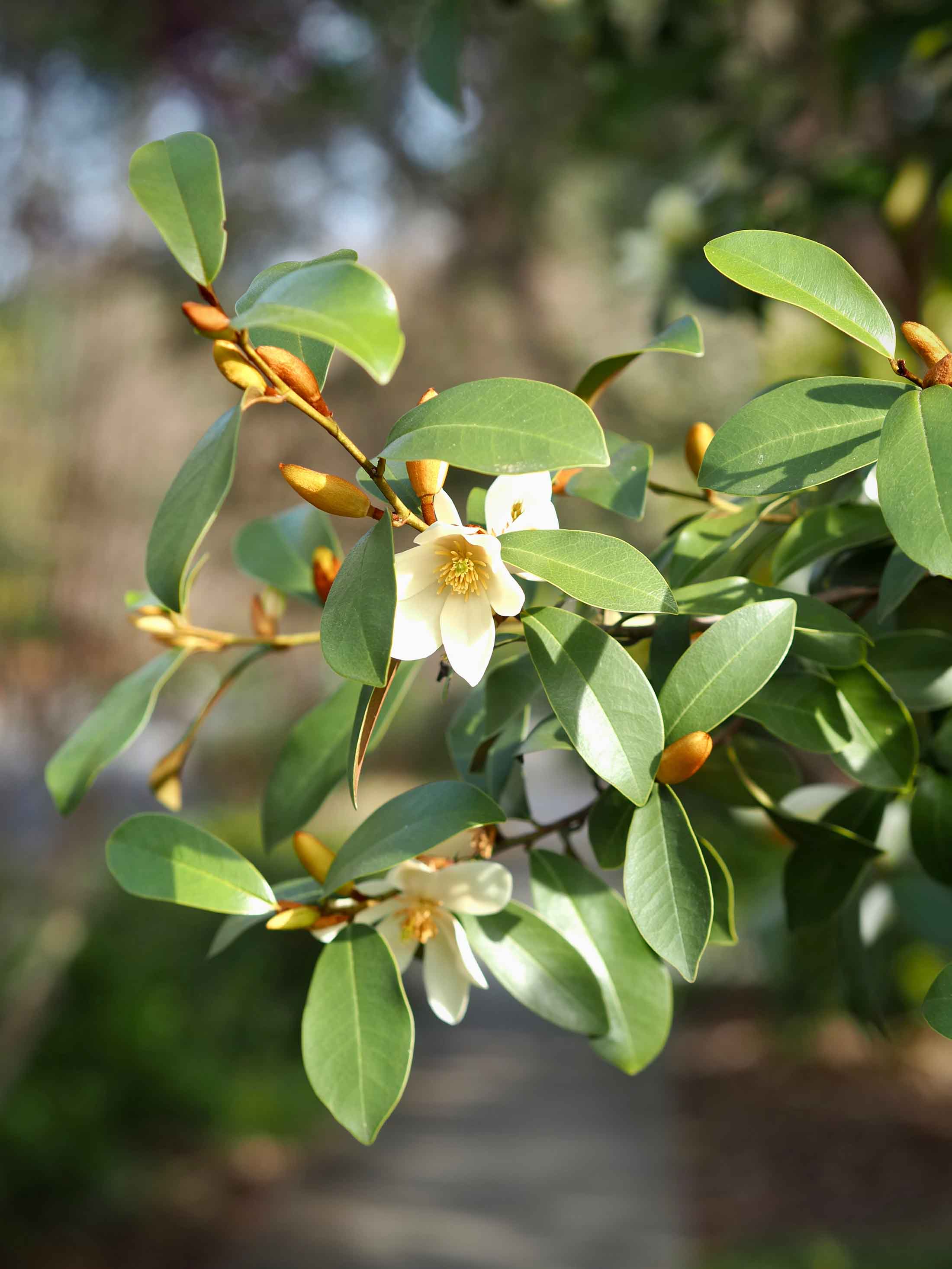This shrubby evergreen magnolia typically grows to about 8 feet tall. The intensely fragrant flowers, the smallest of Stanford’s magnolias, are 1–1½ inches wide with yellowish-cream tepals sometimes edged in purple-brown, and release a distinctive ripe banana scent. They are borne on short shoots in the leaf axils, a characteristic of section Michelia (see M. doltsopa).