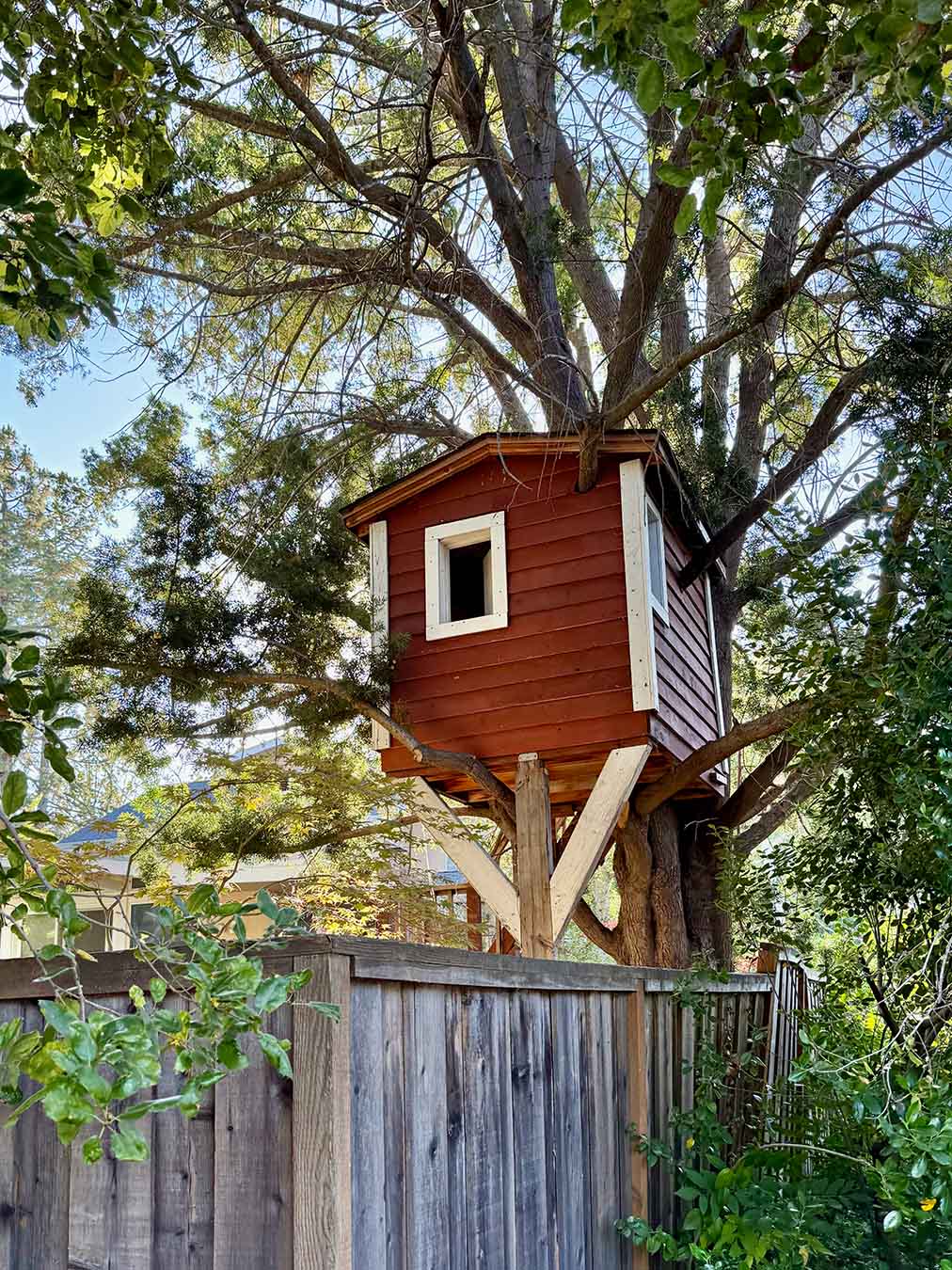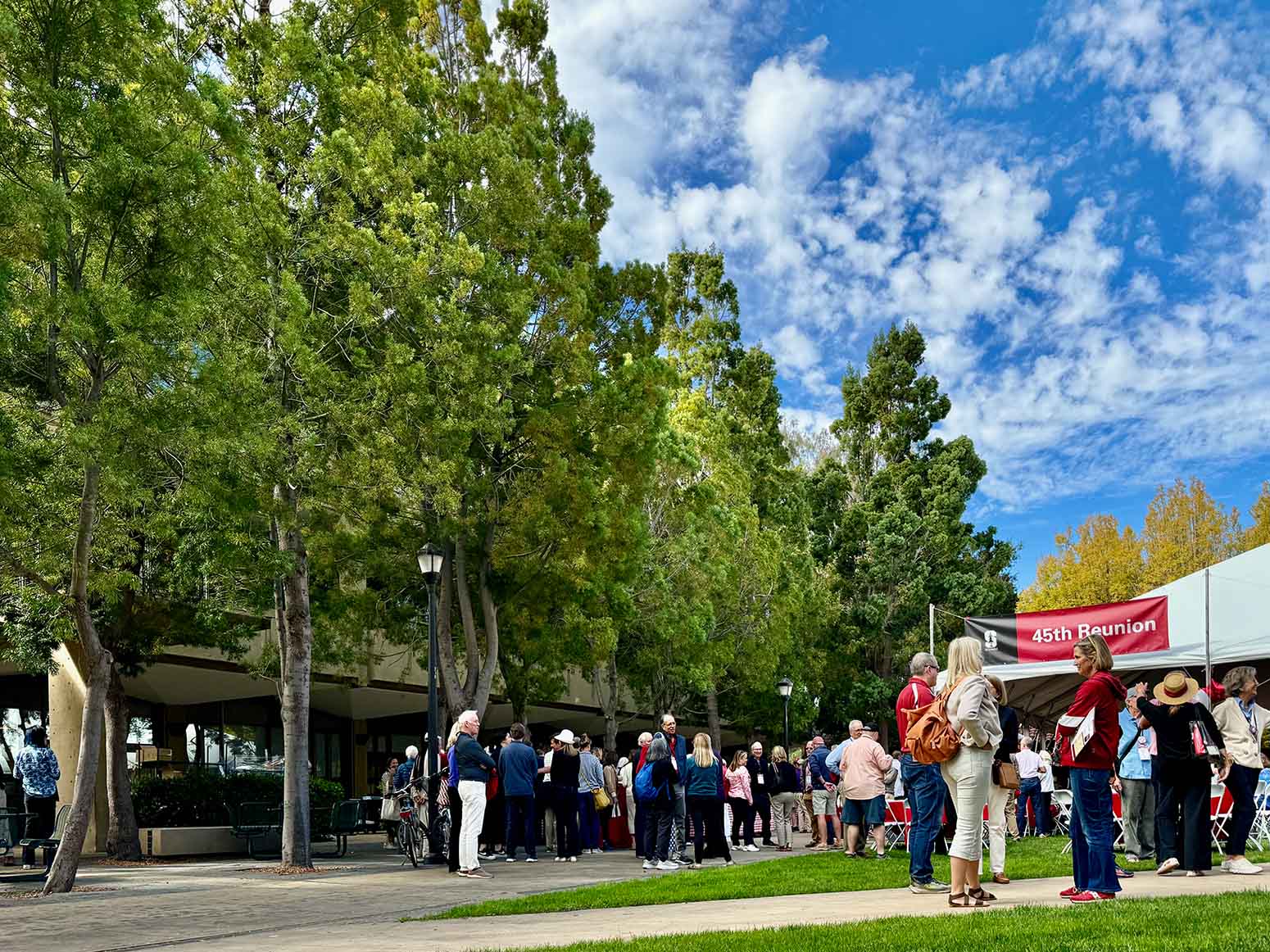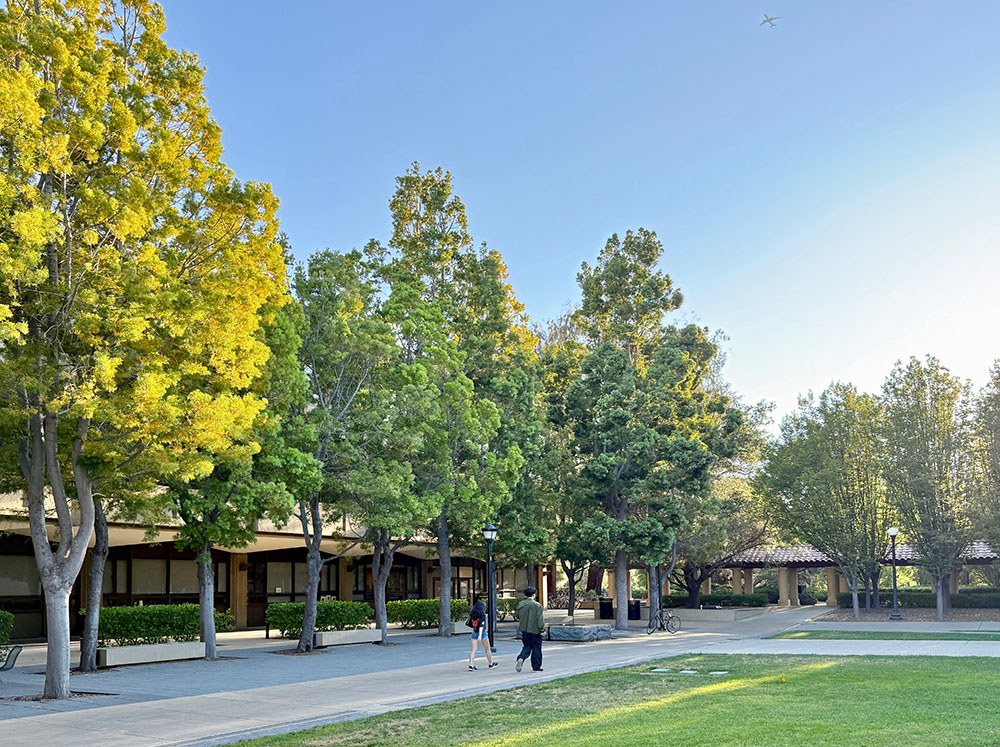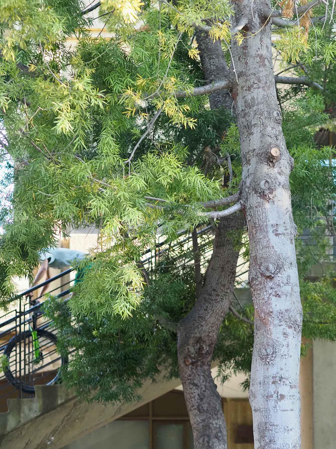 A. falcatus started to be widely planted on campus just before 1970, including in space-limited settings. Young plants can have leaves more than 4 inches long and can tolerate substantial shade for many years. Though its natural habitat is not summer-dry, the species does well locally if given regular water; most of the specimens on Dueña Street appear stunted, likely from compacted soils and insufficient moisture. Eighteen trees are arranged on the north side of Lathrop Library. A massive specimen is left of the Bechtel International Center entrance, with another hidden behind it. One grows at 817 Pine Hill Road. It serves as the street tree at 752 Tolman Drive and nearby, one of them entwined with a treehouse. A row, both males and females, are at 711 Salvatierra Street; you can tell the females by plum-like stains on the sidewalk even after the cones have been swept away. In Palo Alto, large and handsome individuals can be seen at 1106 and 1181 Hamilton Avenue, as well as at 1543 Walnut Drive.