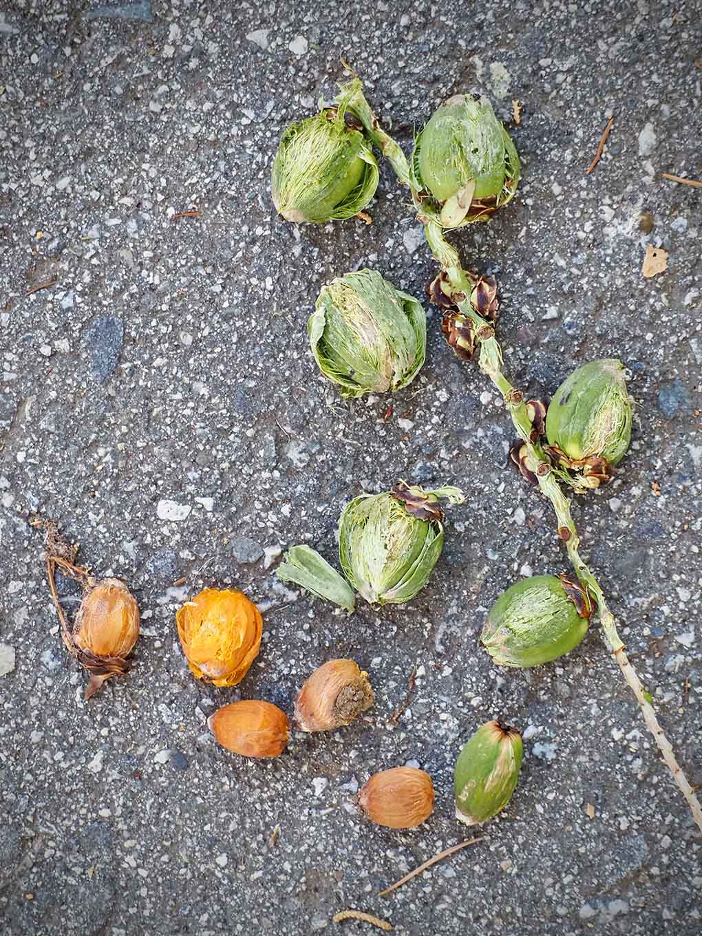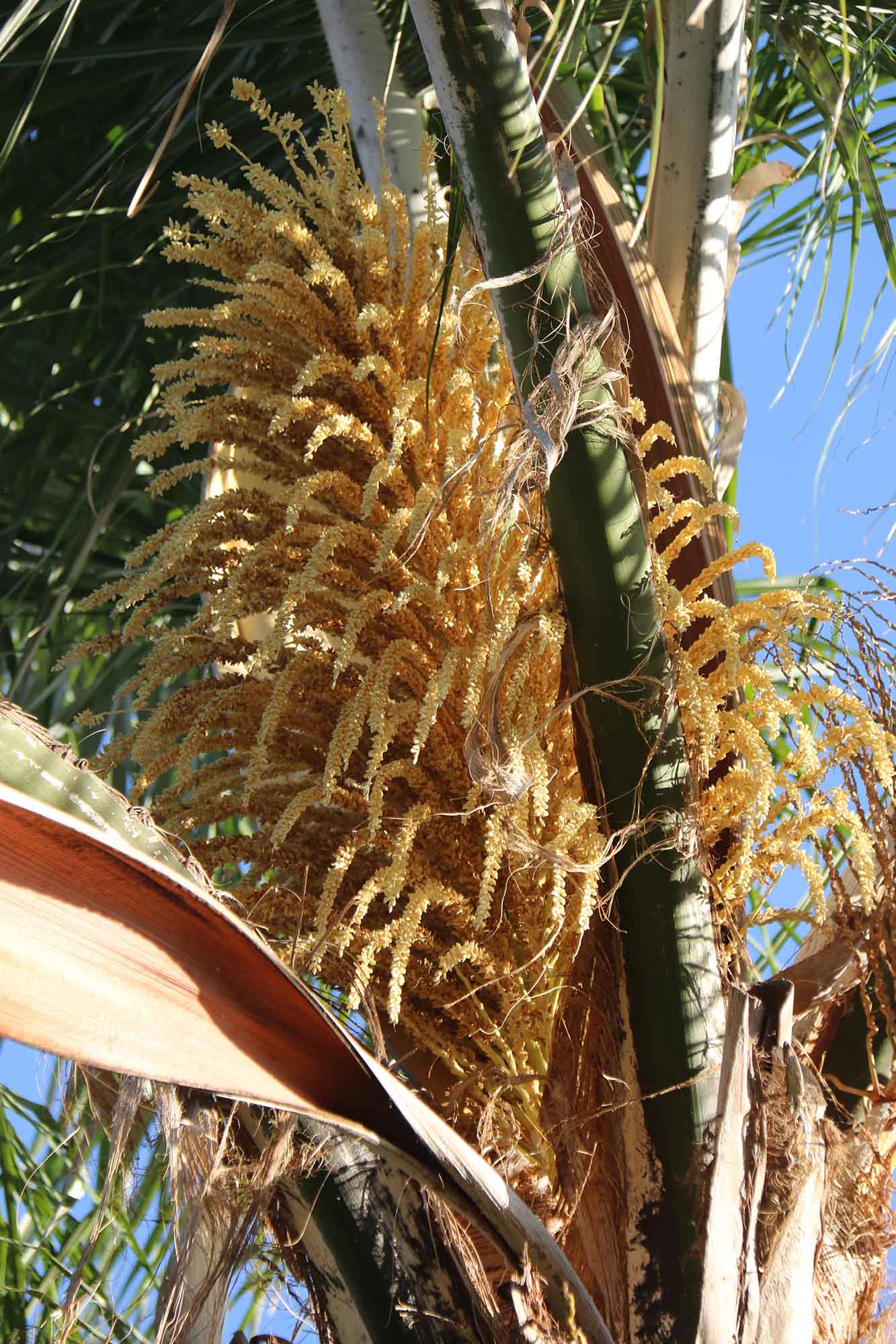 Instantly distinguish this palm from other feather palms on campus by its plumose fronds: the pinnae are arranged loosely around the central stalk rather than lying in a single flat plane, as in the Canary Island date palm. The effect is a ruffled, rather windblown silhouette. Just below the crown, long, tapering leafbases clasp the trunk; when removed, they leave behind a smooth, silvery gray trunk marked with regular rings. Clusters of one-inch orange dates follow the flowers and, in warmer parts of California where the species fruits prolifically as a street tree, create a gloriously colorful mess on sidewalks.